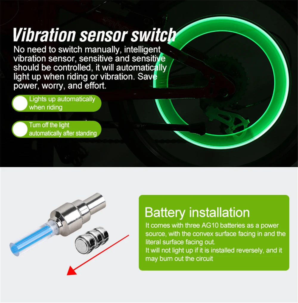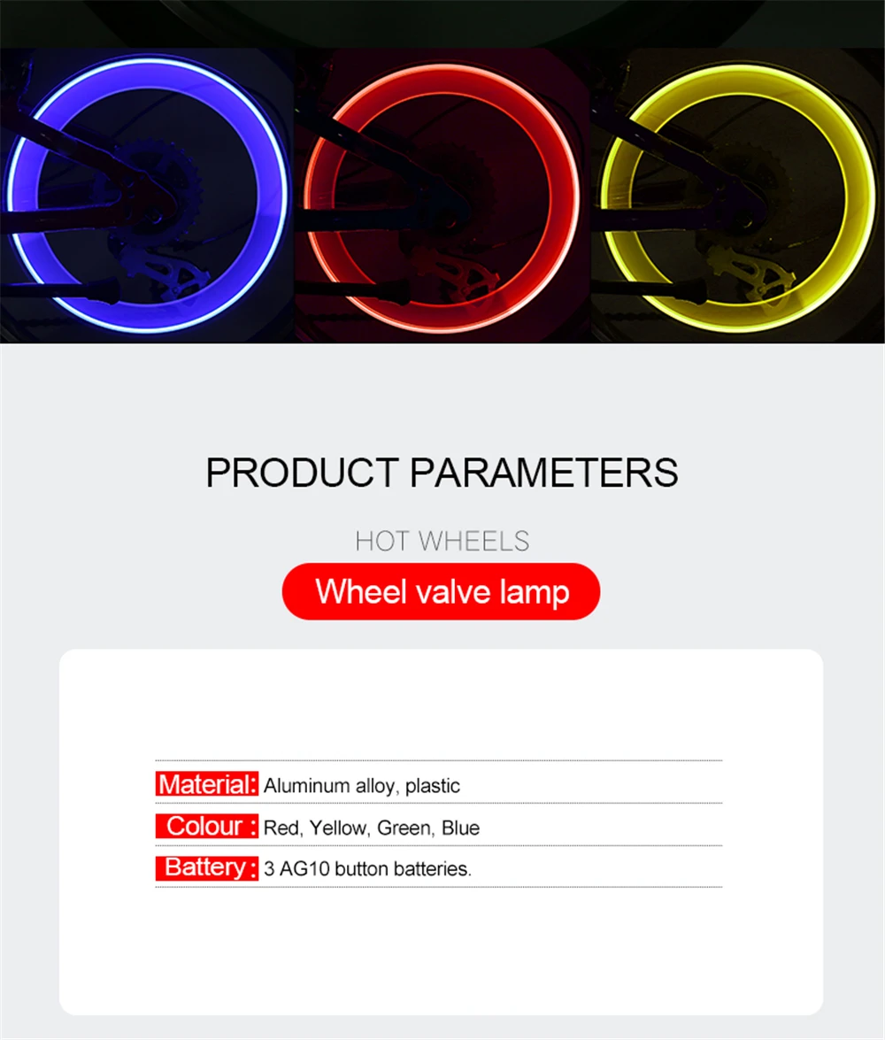 Светильник колеса велосипеда не только придает вашим автомобилям Потрясающий Красивый внешний вид, но и повышает безопасность, увеличивая видимость ночью. Он оснащен датчиками движения, светодиодный подсветкой и сменными аккумуляторами AG10. В том случае, когда это колесо вращается, клапан светильник будет светильник вверх, что делает ваш автомобиль супер красивый и привлекательный. Светильник будет выключен при остановке. Подходит для деревянных клапанов и клапанов schrader. Если клапан presta valve, вам нужно подготовить переходники для клапанов.