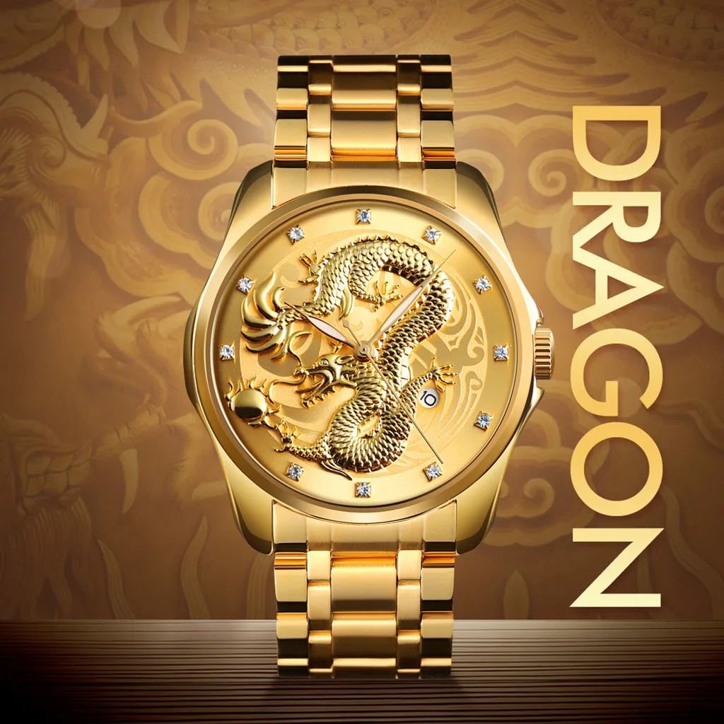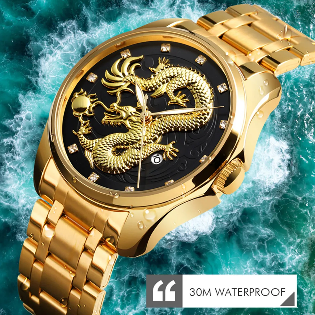 Часы наручные мужские кварцевые, Роскошные водонепроницаемые с календарем и золотым Драконом, со стразами, со стальным ремешком, подарок