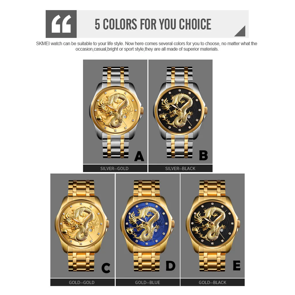 Мужские водонепроницаемые кварцевые часы с календарем и золотым Драконом