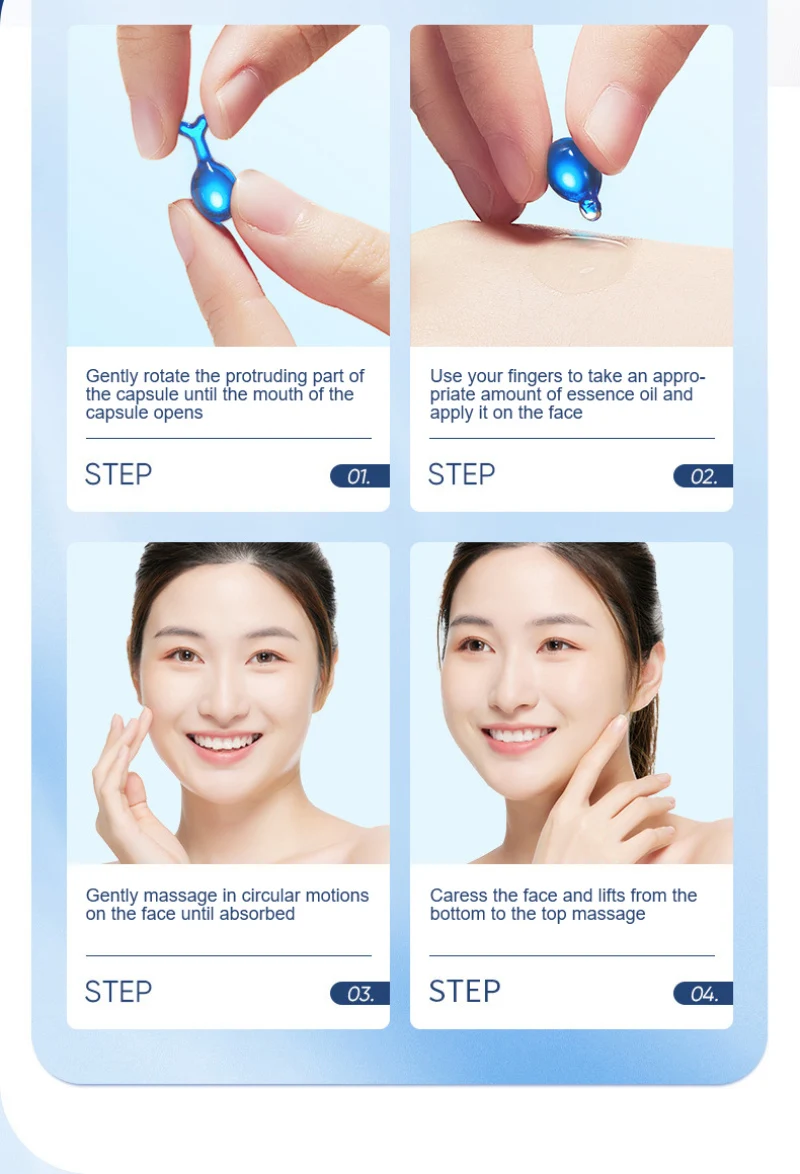Отрежьте рот капсулы и наносите его на лицо, шею и тело каждое утро и вечером перед сном. Массаж мягко в течение 2-3 минут, подходит для всех кож.
