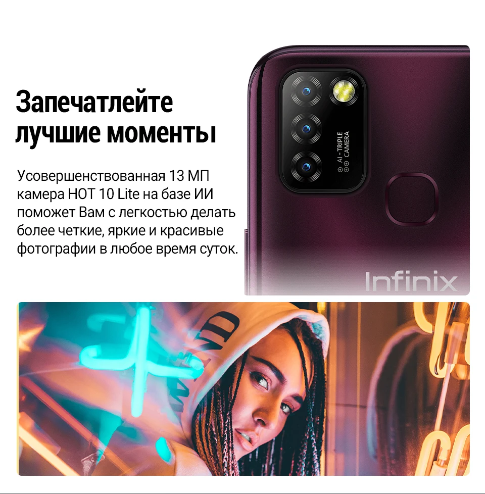 Смартфон Infinix HOT 10 lite 3+64GB 3 модуля камеры 5000мАч разблокировка по отпечатку пальца, российская гарантия официальная
