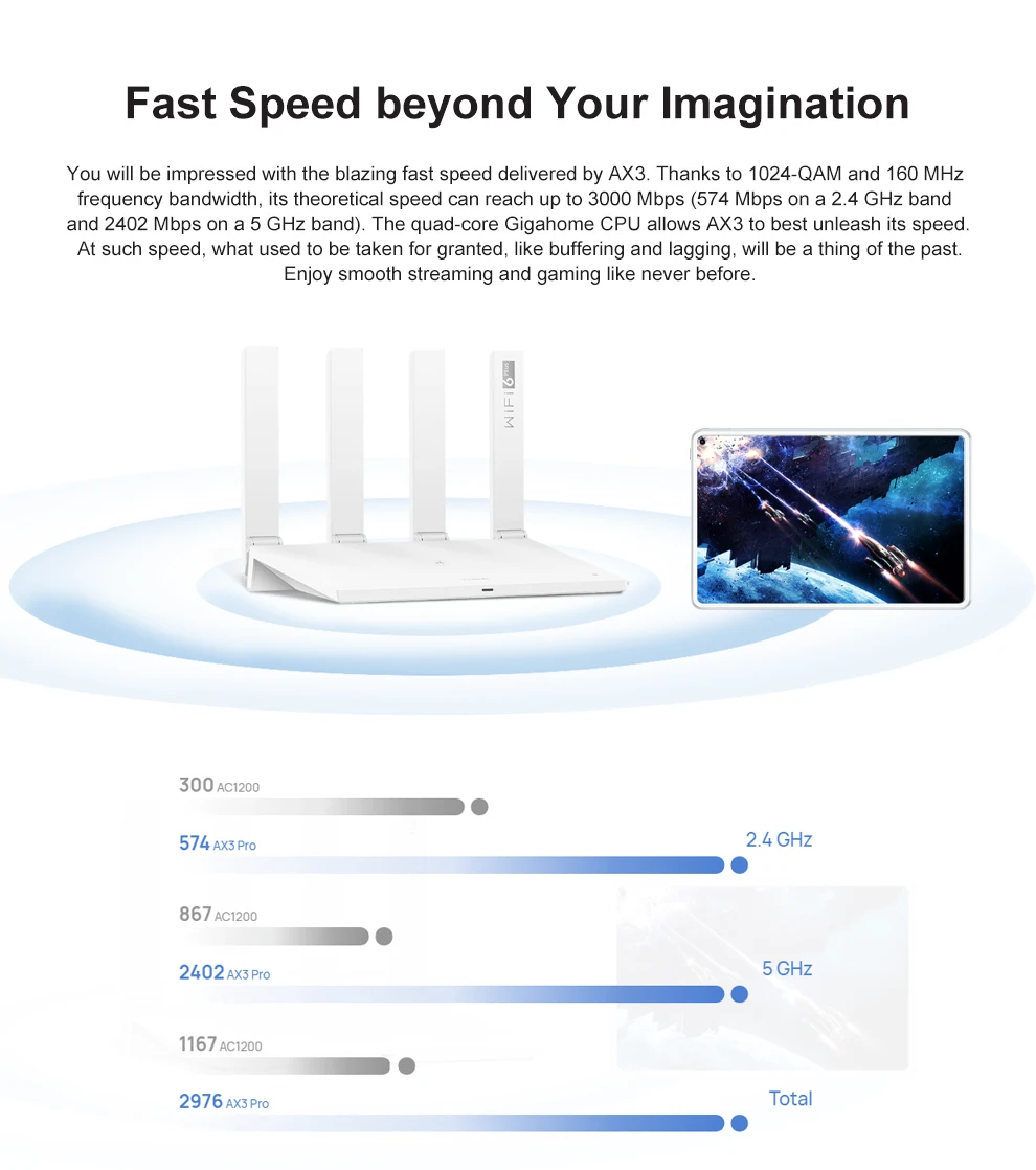 Вы будете imprtssed с bazing быстрая скорость доставки по AX3.Thanks для 1024-QAM и 160 МГц полосы частот, ее теоретические скорости может достигать до 3000 Мбит/с (574 Мбит/с на 2,4 ГГц и 2402 Мбит/с на диапазоне 5 ГГц). Четырехъядерный процессор Gigaphome позволяет AX3 наилучшим образом раскрыть свою скорость. На такой скорости то, что раньше было принято как само собой разумеется. Как буферизация и отставание, будет вещью прошлого. Наслаждайтесь плавной потоковой передачей и играми, как никогда раньше.