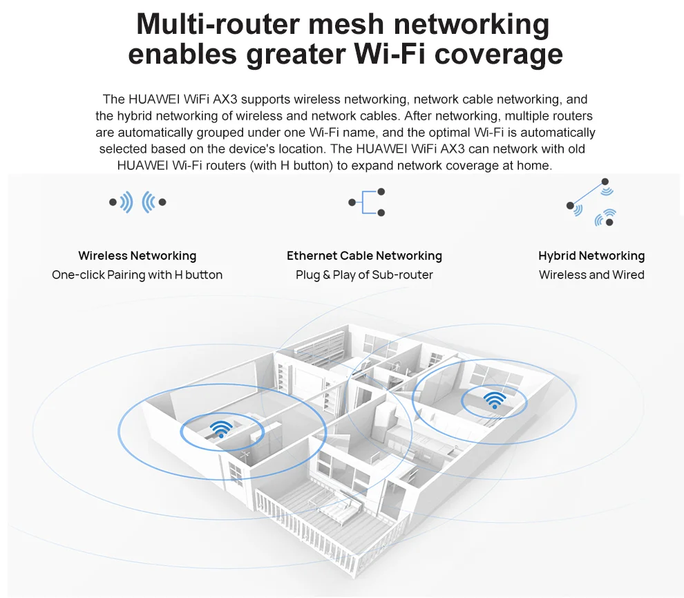 HUAWEI WIFI AX3 поддерживает сеть wirelsee, сеть сетевых кабелей и ГИБРИДНУЮ сеть беспроводных и сетевых кабелей. После подключения к сети несколько маршрутизаторов автоматически сгруппированы под одним именем Wi-Fi, и оптимальный Wi-Fi автоматически удаляется на основе местоположения устройства. HUAWEI WiFi AX3 поддерживает сеть со старыми роутерами HUAWEI Wi-Fi (с кнопкой H), чтобы расширить охват сети дома.