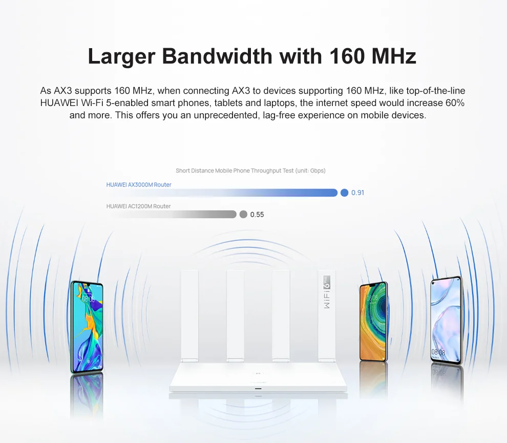 Ускорьте работу телефонов HUAWEI Wi-Fi с 6-ю поддержкой HUAWEI Wi-Fi 6 PlusAX3 и Wi-Fi 6 с поддержкой телефонов HUAWEI являются идеальным, потому что оба оснащены HUAWEI собственной разработки Wi-Fi чипсет, которые поддерживают 160 МГц полосы частот. Это закладывает основу для сочетания чипсет, обеспечивая оптимальную скорость и эффективность.