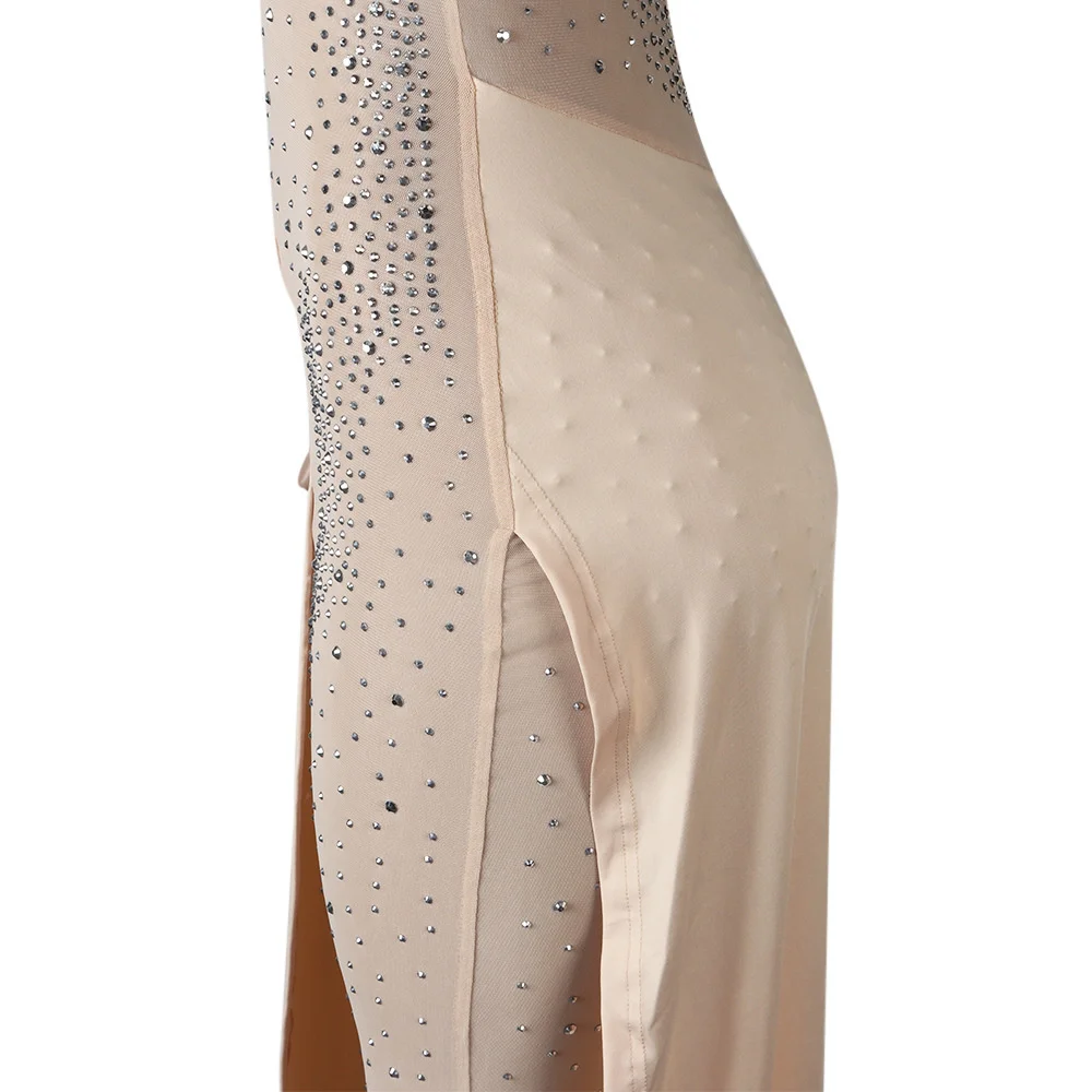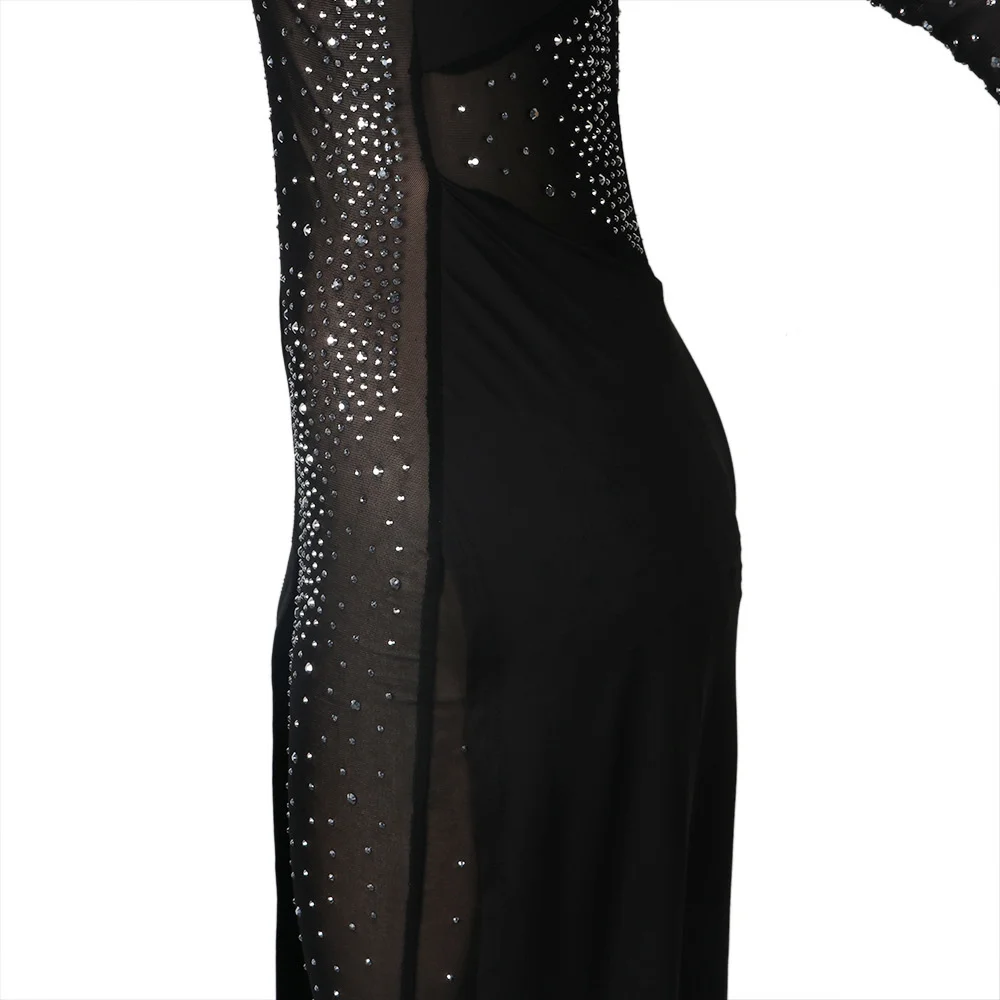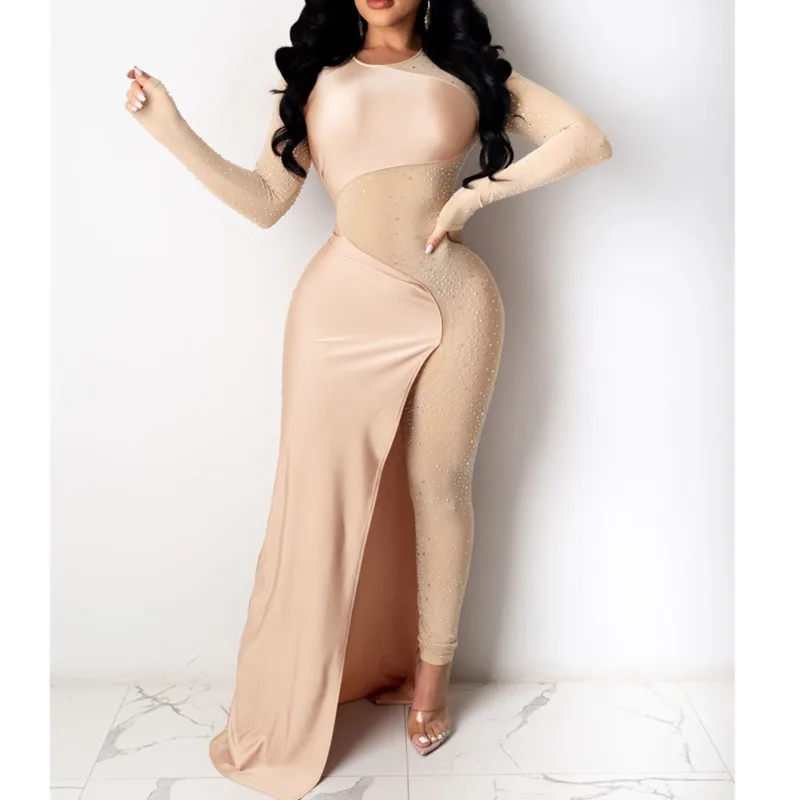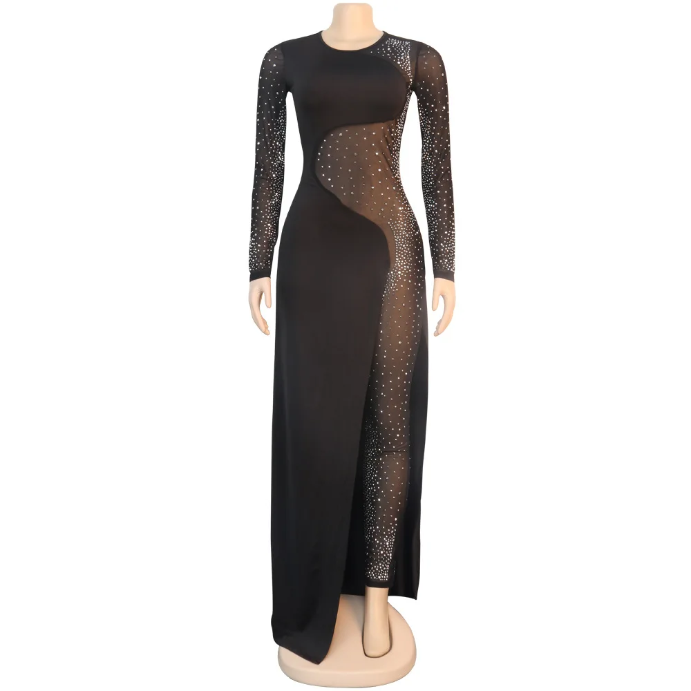 Элегантный женский Облегающий комбинезон с длинным рукавом, вечерний клубный комбинезон с высоким разрезом и стразами, прозрачный облегающий женский праздвечерние чный комбинезон