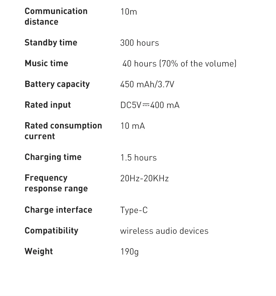 Встроенный литиевый бартерий емкостью 450 мА · ч имеет 10 мА низкого энергопотребления в течение 40 часов непрерывной работы, когда-то полностью заряжен, прослушивание музыки в течение всей недели и 5 часов в день