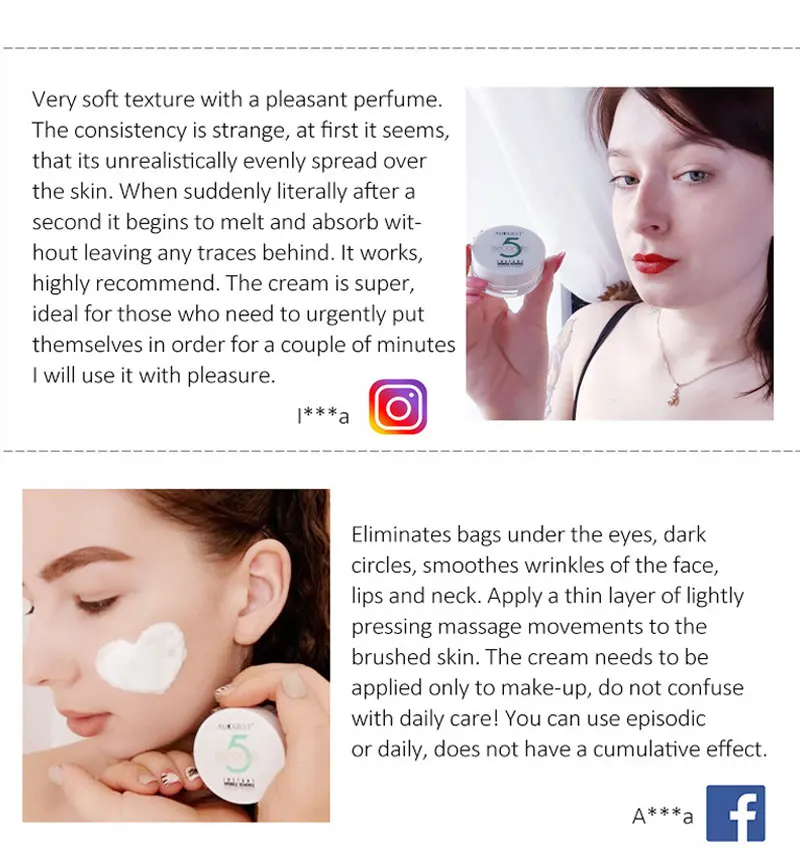 Наименование товара: крем от морщин на 5 секунд Ингредиент: Гидратация двадцать один пептид, чистая натуральная рыба карп активный кристаллический гидрат, шесть пептидов, шелк пептид, увлажняющий фактор ха, Houttuynia против морщин фактор, лупа десен, мирра, азон, колдунья hazel жидкость, гидролизованный эластин Вес нетто: 20 г Подходит для: мешков для глаз, гусиных лапок, морщин лица, губ и шеи
