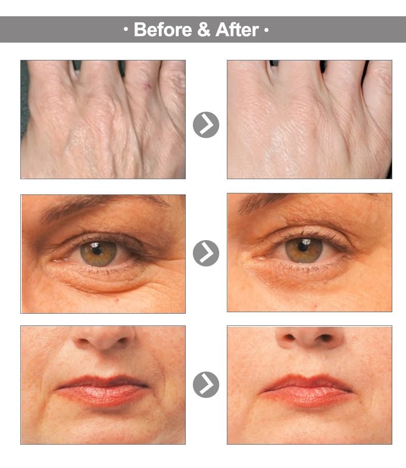 Без морщин 1. Глаз Гусиные лапки, отечность, опущенные брови и век 2. Лоб Тонкая линия и провисание кожи 3. Лицо Изменение контура лица 4. Рот Тонкие губы и книзу Пептид + жидкий коллаген Многоэффектный ремонт, показывающий безупречную яркую кожу Пептид гидратации Драматическая подтяжка кожи, повышение упругости и упругости кожи, стимулирование регенерации клеток, уменьшает появление морщин и линий. Увлажняющий фактор HA Глубоко питает кожу, эффективно детоксикация, драматически контролирует масло и уменьшает внешний вид пятен, ускоряет кровообращение. Гидролизованный эластин Стимулирует увеличение коллагена и укрепляет эластичные ткани, глубоко увлажняет кожу и устраняет мелкие морщинки.