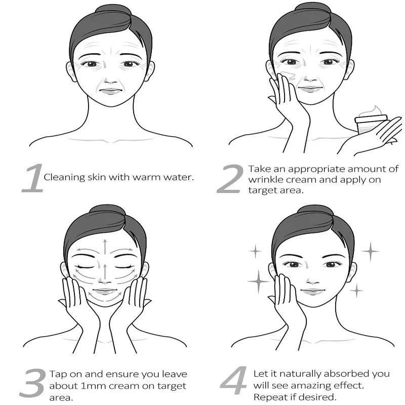 1. Очистка кожи теплой водой. 2. Возьмите соответствующее количество крема от морщин и нанесите на целевую область. 3. Нажмите и убедитесь, что вы оставили около 1 мм крема на целевой области. 4. Пусть он естественно впитывается, вы увидите потрясающий эффект. Повторите, если хотите. Теплый совет: это функциональный крем, не восстанавливающий крем. Используйте, когда вам нужно.