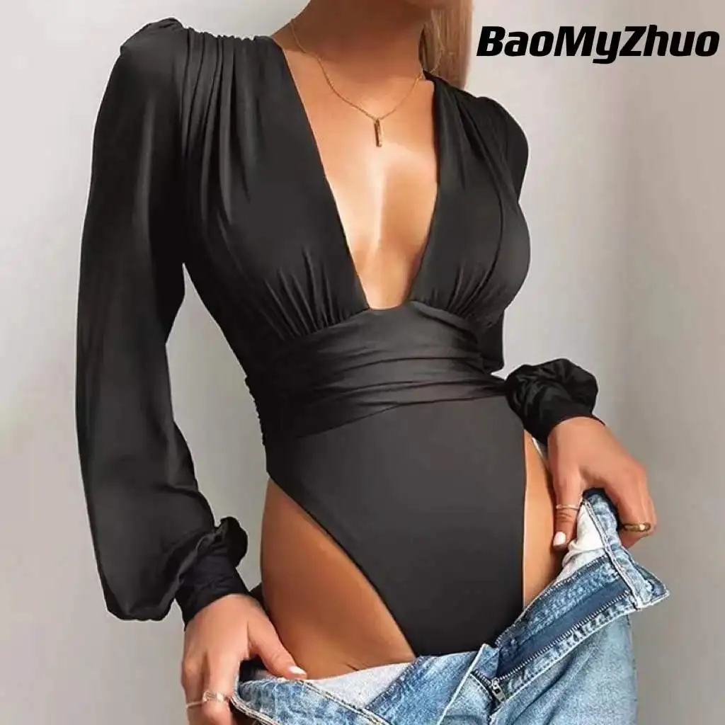 Женское трикотажное боди с длинным рукавом и V-образным вырезом