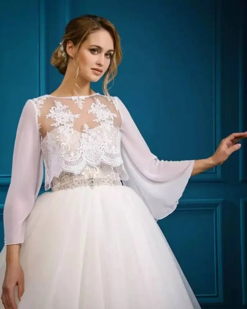 Белый кружевной свадебный пиджак-болеро с шифоновыми длинными рукавами и пуговицами, свадебные кружевные накидки цвета слоновой кости, Свадебный Болеро