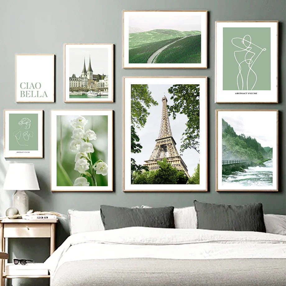 Настенная живопись на холсте, пейзаж Парижа, башни, гор, дома, цветов, абстрактная девушка, Зеленый пейзаж, плакат и принты для декора гостиной