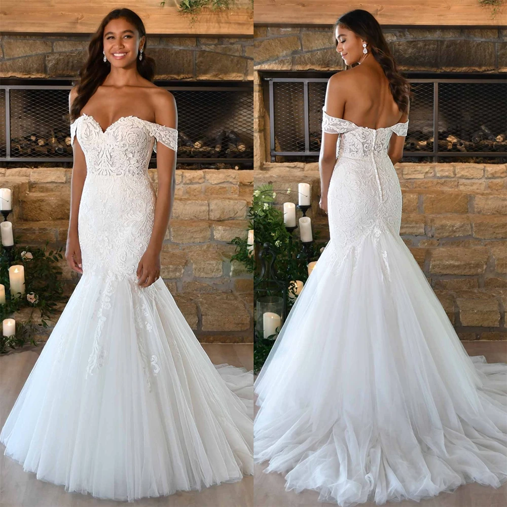 Женское свадебное платье с юбкой годе, элегантное платье с открытыми плечами и кружевной аппликацией, платье невесты на пуговицах