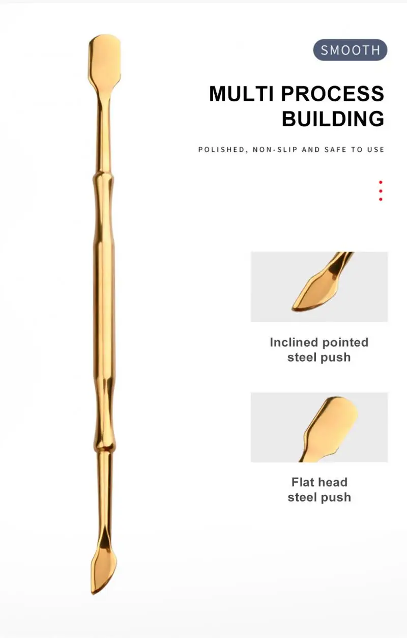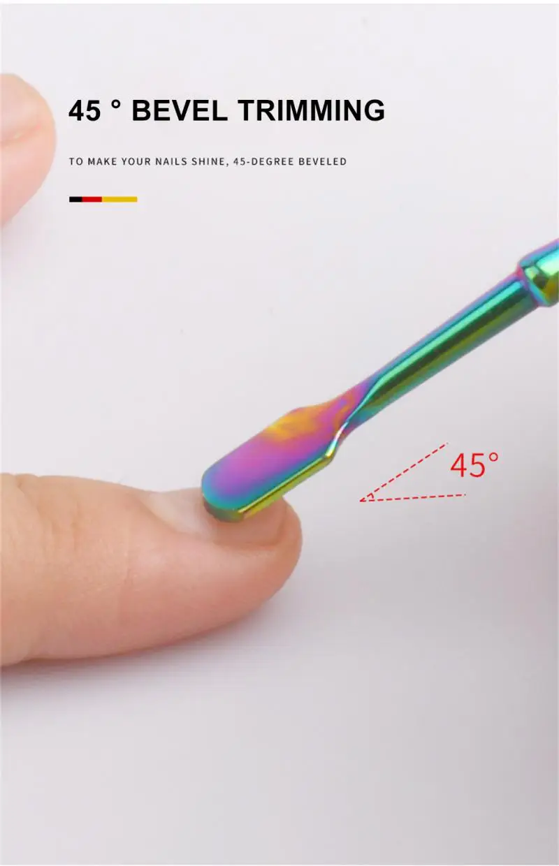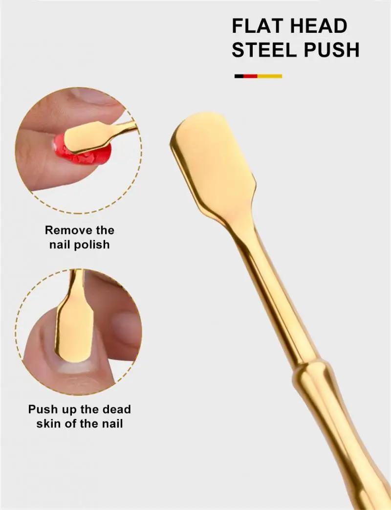 3. Наклонный Стальной Толкатель. Он может погружаться глубоко в шов ногтя, чтобы очистить грязь и так далее. Стальной Толкатель с плоской головкой, быстро очищает грязь и омертвевшую кожу на поверхности ногтей