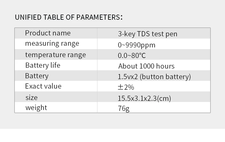 1. Meetbereik: 0-9990 ppm,2 .. Разрешение: 1 ppm3. uitlezing Nauwkeurigheid: +/- 2%4. Мощность bron: 2x1,5 V(LR44 Knoopcel) (вы не должны inbegrepen)5. Температура: температура воды, 31 - 200 F graden,