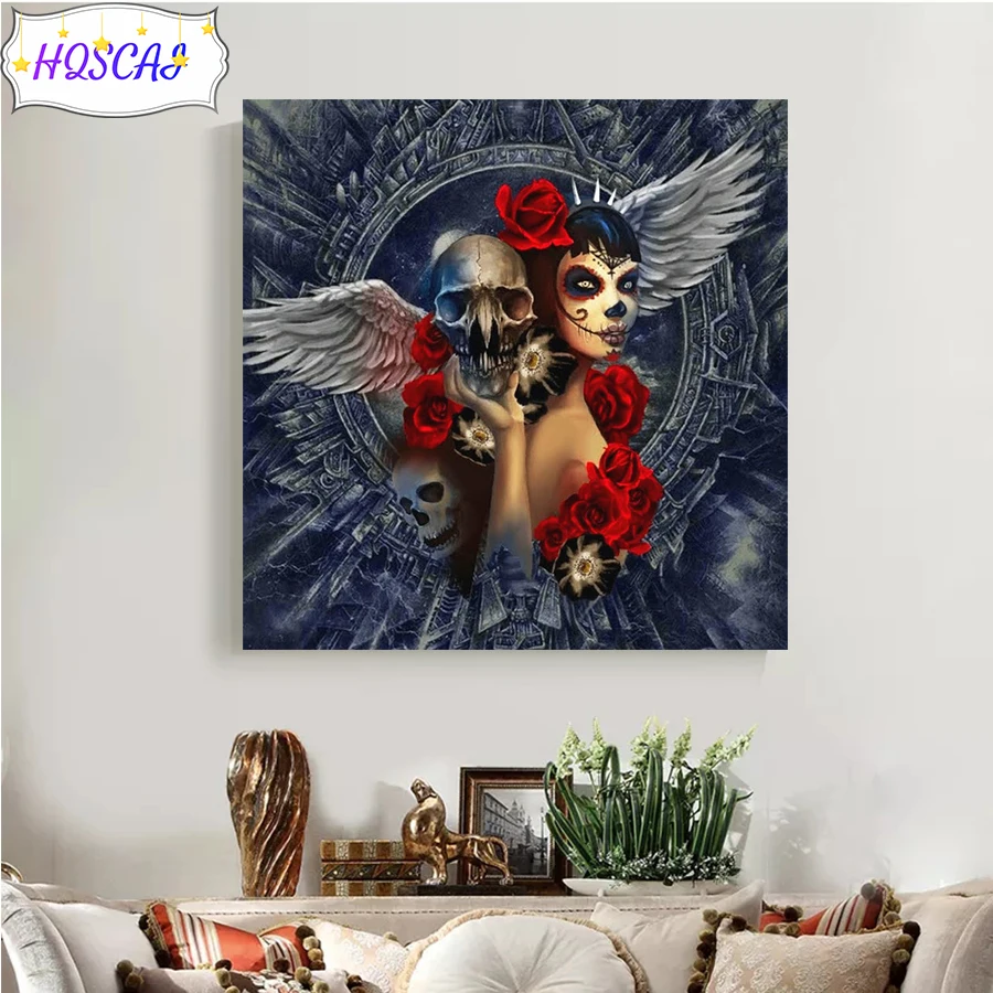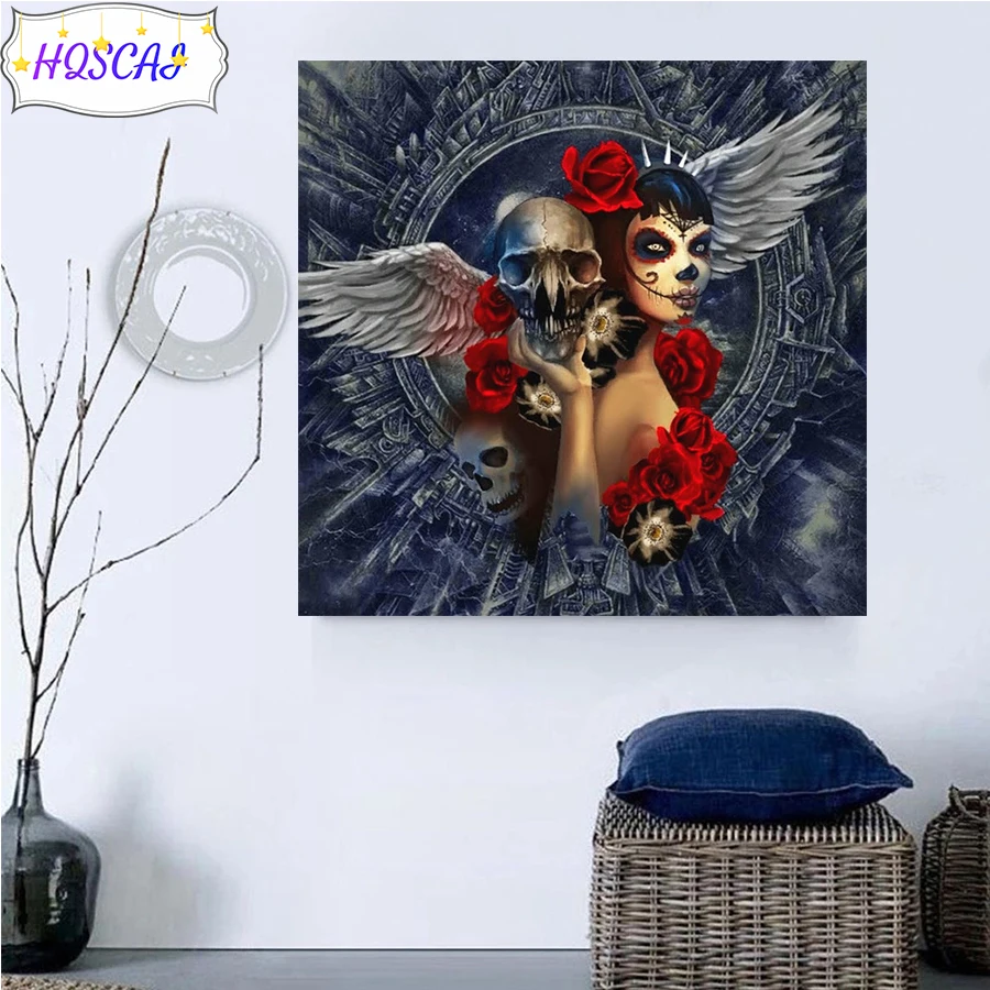 Алмазная живопись сделай сам, крылья, Череп, красная роза, вышивка крестиком, искусство бриллиантов, искусство, картины для украшения дома