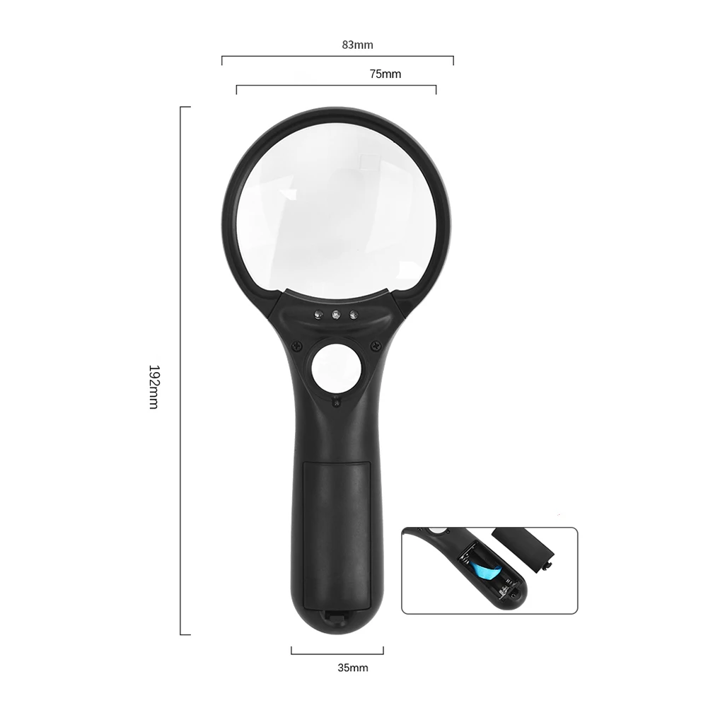 3x/45x HD ручной увеличительное стекло объектив с 4LED подсветкой Лупа для пожилых чтения ювелирных изделий инспекции Спецификация: Материал: корпус из АБС-пластика, стеклянные линзы, акриловые линзы Размер: 192*83*16 мм/7,56*3,27 * 0.63in Диаметр линз: 75 мм/2,95 дюйма, 20 мм/0,79 дюйма Увеличение: 3x, 45x Источник освещения: три белых светодиодный лампы, УФ-лампа для проверки денег Параметры батареи: 3 батарейки AAA (не входят в комплект) Упаковочный лист: увеличительное стекло, инструкции на китайском и английском языках, цветная коробка Примечание: В связи с различиями мониторов и эффектами освещения реальный цвет товара может немного отличаться от цвета на фотографиях. Спасибо! Возможны отклонения в 1-2 см вследствие измерений вручную.