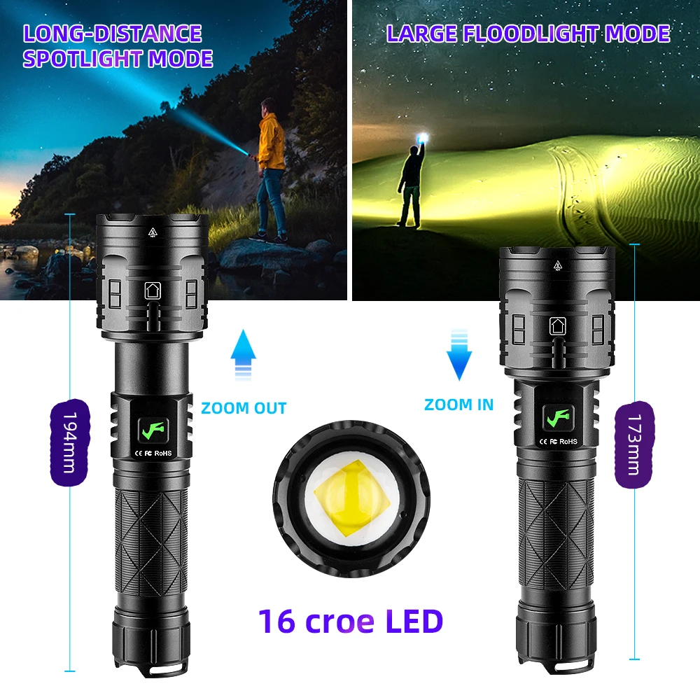 Новая быстрая зарядка USB Type-c, функция отображения мощности, увеличенная функция вывода, может использоваться в качестве мобильного источника питания для зарядки мобильных телефонов, объектив увеличен, диапазон освещения шире, И задняя функция молотка безопасности используется для аварийного выхода. Противоскользящие линии на корпусе трубки, нажав на голову.