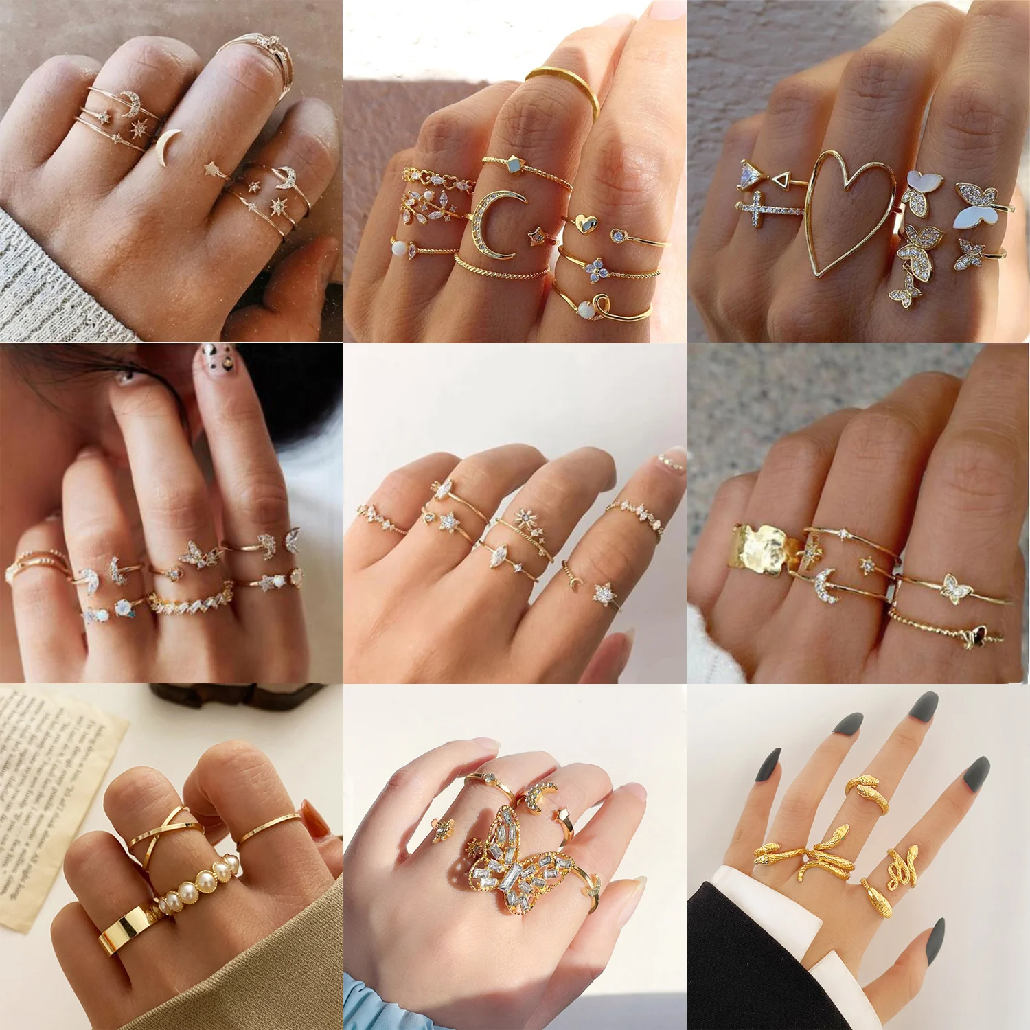 Богемное металлическое кольцо с бабочкой из кристаллов, набор для женщин, модное эффектное кольцо с Луной и звездой, геометрическое кольцо, вечерние ювелирные изделия, подарок