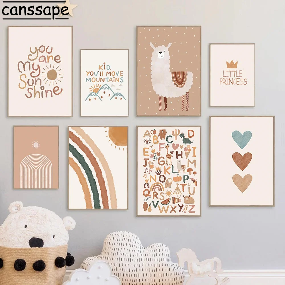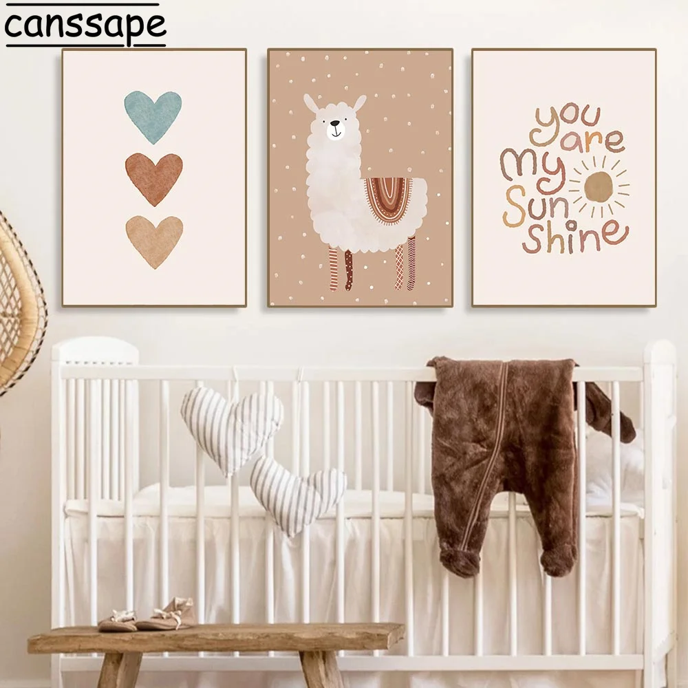 Картина с альпакой в стиле бохо, мультяшный постер, Радужное солнце, картины на холсте, принты с надписью Love, Скандинавская картина на стену, декор для детской комнаты