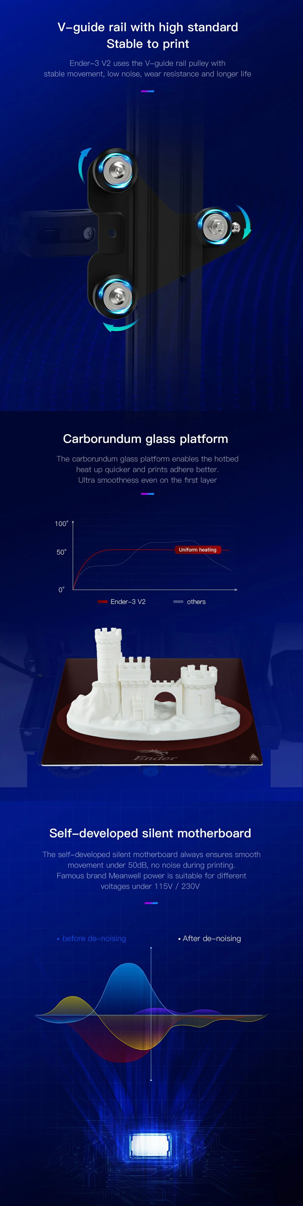 Обновленная материнская плата с бесшумными шаговыми драйверами TMC2208: по сравнению с Ender 3 и Ender 3 pro, v2 дизайн, который обеспечивает пользователям внешний вид и беззвучные обновления (более тихие 3D принтеры).