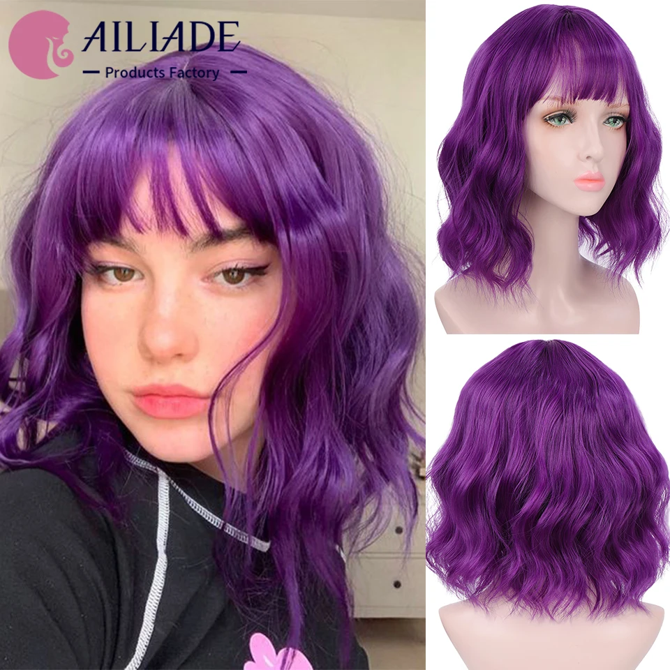 Парик AILIADE с короткими волнистыми волосами, синтетические волосы с челкой, чёрныйпурпурный, для косплея, вечеринки в стиле Лолиты, с эффектом омбре