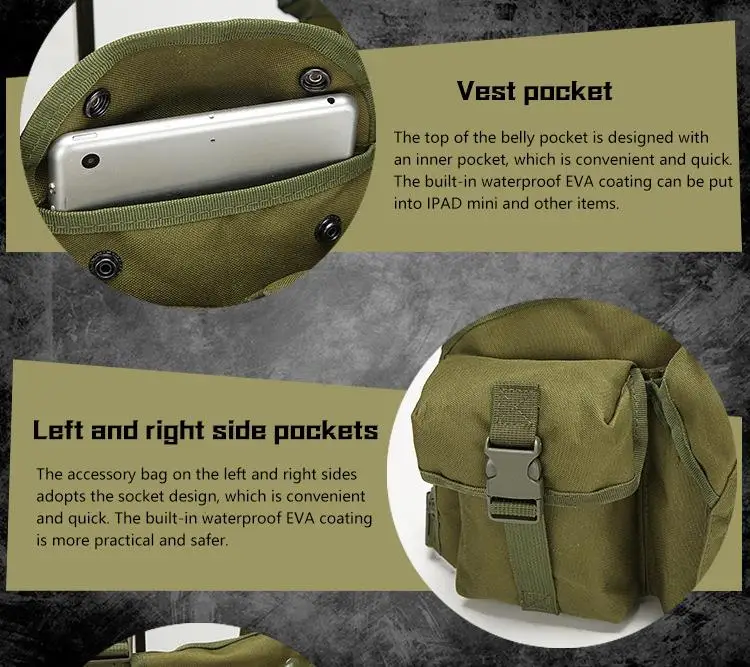 Тип изделия: поясные сумки Материал: нейлон 600D Пол: мужчин, wo мужчин, унисекс Размер: 25х15, 5х7 см Вес: 0,45 кг Цвет: черный, зеленый, десять, темный Камуфляж Особенности: прочный, регулируемый, износостойкий, устойчивый к разрыву1. Изготовлен из высококачественного нейлона 600D с прочными характеристиками,Прочный, износостойкий и износостойкий, имеет долгий срок службы.2. Он может быть оснащен walkie-talkies или беспроводными устройствами, такими как mobileТелефоны, GPS, электронные детекторы и т. д. это более удобно и быстро. ВКарман также может держать ключи, карту, мобильный телефон и другие аксессуары.3. Сумка разработана с регулируемыми лямками, которые можно регулироватьВ соответствии с потребностями.4. Этот нагрудный мешок будет одним из обязательных предметов для модных людей,Легко носить с собой, отпустите руки.5. Подходит для выживания, пеших прогулок, езды на велосипеде, работы, школы, кемпинга, рыбалки,Путешествия, подарок, отдых