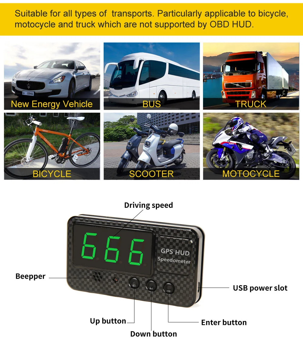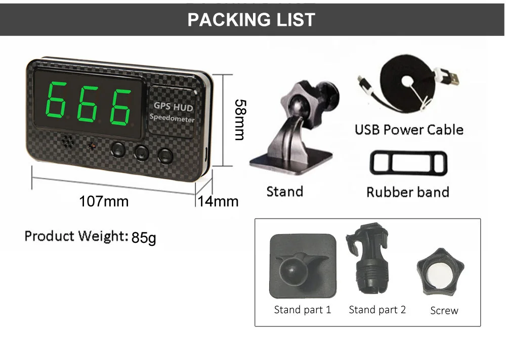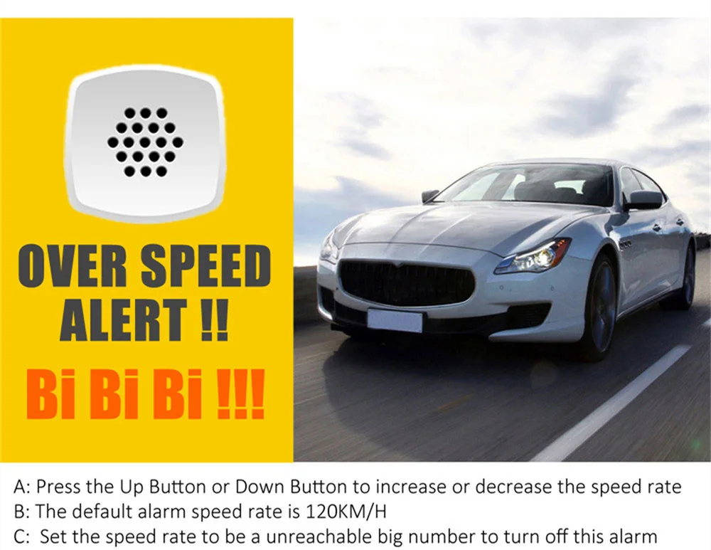 Характеристика:1) дисплей на голову2) расчет и отображение времени вождения и пробега3) Простая настройка -- Plug & Play --- питание через прикуриватель автомобиля. Профессиональная установка не требуется.4) совместим со всеми автомобилями, грузовиками, мотоциклами и велосипедами. Используйте gps-сигнал для подсчета. Не требуется подключение к VSS (сигнал скорости транспортного средства).5) Отображение миль/ч или км/ч6) Автоматическая регулировка яркости через датчик для вождения днем и ночью.7) дисплей скорости вождения транспортного средства. Зеленый цвет дисплея скорости, легко на глаза.8) Настройка сверхскоростной сигнализацииРуководство по эксплуатации:1. Установите скорость сигнала тревогиA: нажмите кнопку вверх или вниз, чтобы увеличить или уменьшить скоростьB: скорость сигнала тревоги по умолчанию составляет 120 км/ч2. Установка счетчика скорости (км или миля)О: Нажмите кнопку ввода, если вы видите номер 100, показанный на экране, что означает км/чB: Нажмите кнопку ввода, если вы видите номер 161, показанный на экране, что означает MPHC: по умолчанию прибор для измерения скорости устанавливается как км/ч3. Дисплей записи данных вождения1) Система начнет расчет общего времени вождения и пробега при включении устройства.2) время парковки не включено в расчеты для повышения точности данных.3) пробег менее 1 км будет считаться недействительным4) как только транспортное средство останавливается в течение нескольких секунд, вы увидите, что на экране отображается мигание, как общий пробег, а затем данные без вспышки-это общее время вождения за считанные минуты.5) все данные о вождении будут очищены, как только транспортное средство выключено, и система начнет расчет снова, когда мощность автомобиля возобновится.4. Сигнализация На Усталость вожденияВ течение каждого часа система запускает сигнализацию от усталости вождения с непрерывным отображением времени вождения, чтобы напомнить водителю, чтобы избежать сонливого вождения.Пример: 001 означает одночасовое непрерывное вождение, 002 означает двухчасовое непрерывное вождение и так далее.5. Сигнал тревоги о превышении скорости1) Установите скорость сигнала тревоги (как описано выше)2) при превышении скорости срабатывает звуковой сигнал в три раза.3) при непрерывном обнаружении превышения скорости сигнал тревоги больше не срабатывает.6. Регулируемая скоростьСкорость отображения может регулироваться вручную. Нажмите и удерживайте кнопку вверх и введите кнопку одновременно. На нем будут показаны цифры от 650 до 669.Скорость по умолчанию составляет 665, если вы хотите увеличить скорость отображения с 1 км/ч, настройте скорость до 666; И если вы хотите уменьшить его с 1 км/ч, настройте скорость до 664.7. Технические характеристики1) время позиционирования GPS: от 1 до 5 минут на открытом воздухе (плохая погода повлияет на время позиционирования).В помещении нет gps-сигналов.2) отклонение скорости: поскольку данные о скорости поступают с gps-спутника, незначительное отклонение неизбежно.3) Входное напряжение: 5 в пост. Тока Входной ток: 30-60 мА пост. Тока банк питания для источника питания поддерживается.4) Рабочая температура: от-30 до 70 градусов5) отклонение данных вождения составляет около 2%6) Все данные вождения будут очищены при выключении питанияПараметры продуктаМодель: C60SЦвет: черныйМатериал: АБС-пластикРазмер: о