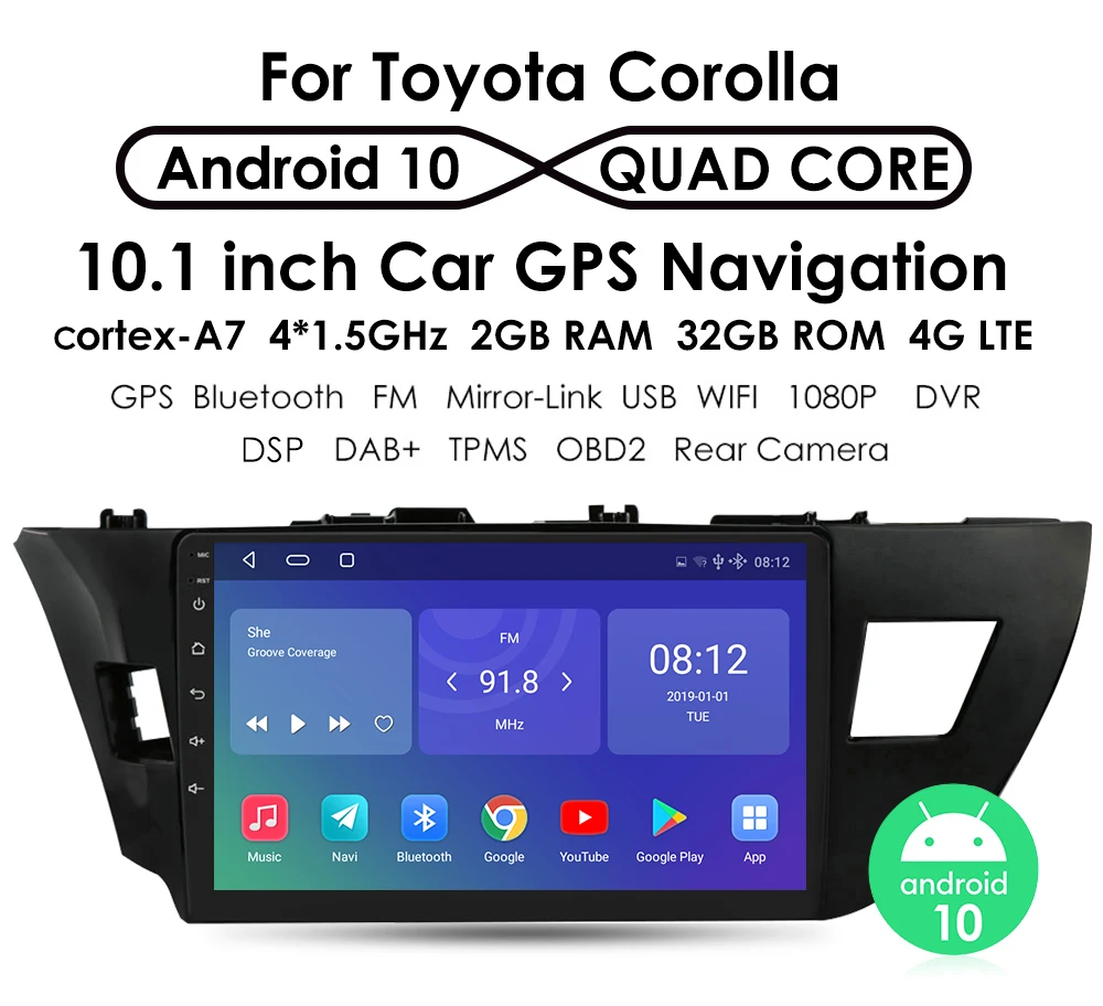 Автомагнитола 2 DIN, 10 дюймов, Android 10, для Toyota Corolla 2014, 2015, 2016