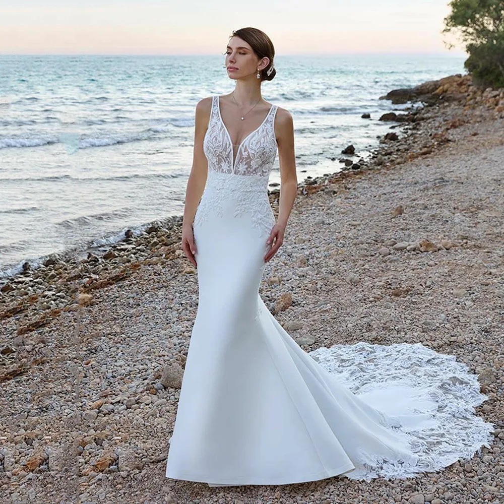 Женское атласное платье-Русалка с V-образным вырезом и длинным шлейфом