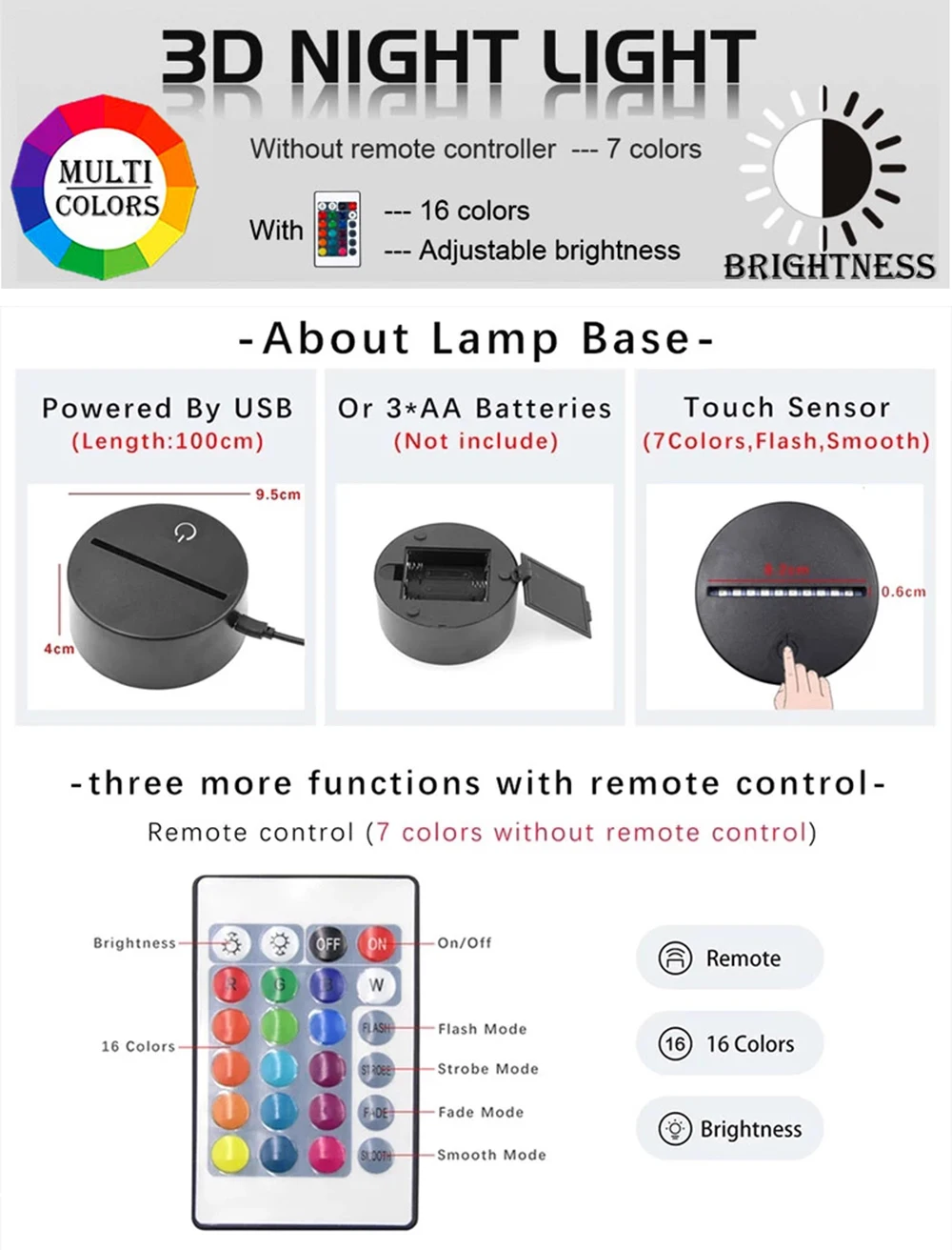 3D ночник, 16 цветов, преобразующий свет, Академия, DABI, светодиод...