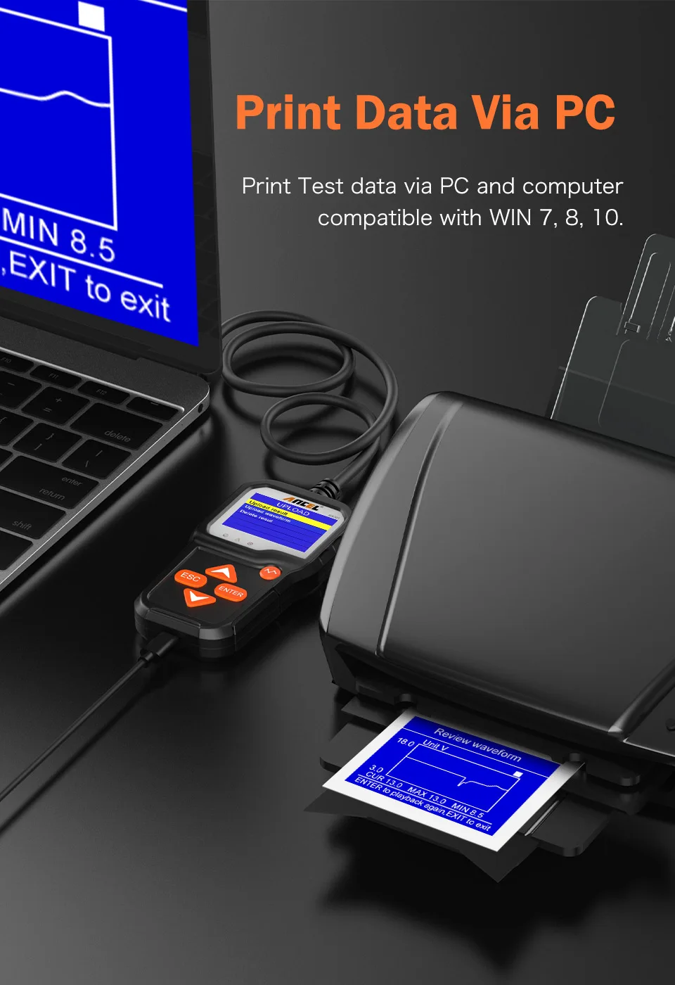 Более точный тест на батарею-позволяет проверить автомобильную батарею на основе местоположения батареи внутри транспортного средства или за его пределами, емкость для анализа состояния здоровья батареи и быстрого обеспечения более точных результатов тестирования, отображает значение напряжения, стандартный CCA, измеренный CCA, SOH (%), SOC (%), Внутреннее сопротивление и многое другое.