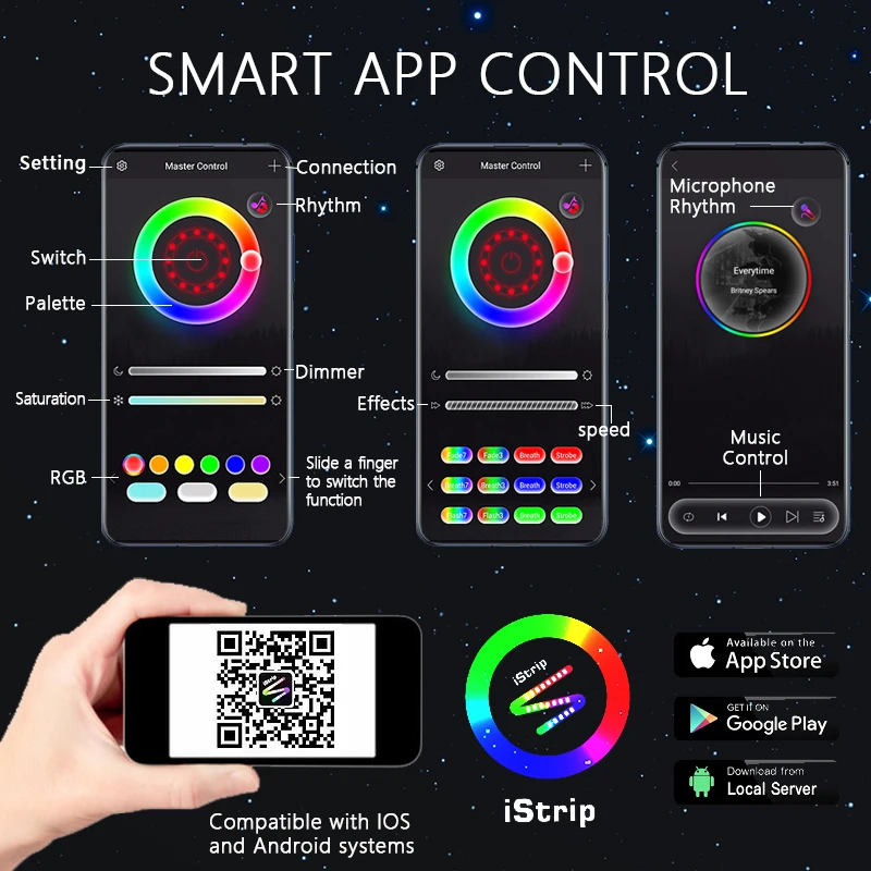【Smart APP control】 Smart APP позволяет управлять переключателем, изменением цвета, регулировкой яркости и т. д. он предлагает 16 миллионов цветов на выбор. Различные световые эффекты дают вам разное настроение. Естественное и Аутентичное освещение создает расслабляющую и романтическую атмосферу.