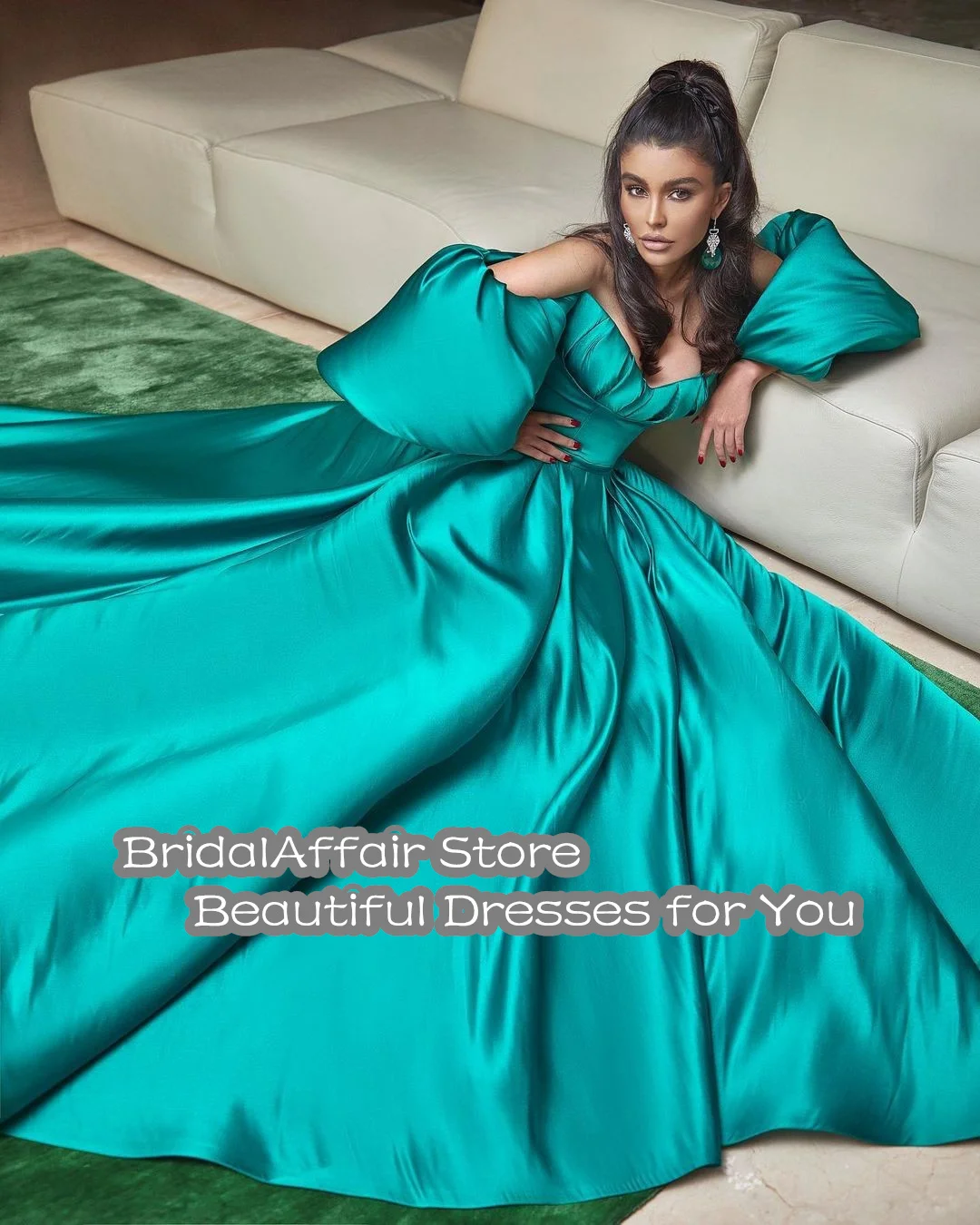 BridalAffair 2022, элегантное зеленое атласное длинное бальное платье с длинными рукавами, украшенное кристаллами, арабское вечернее платье