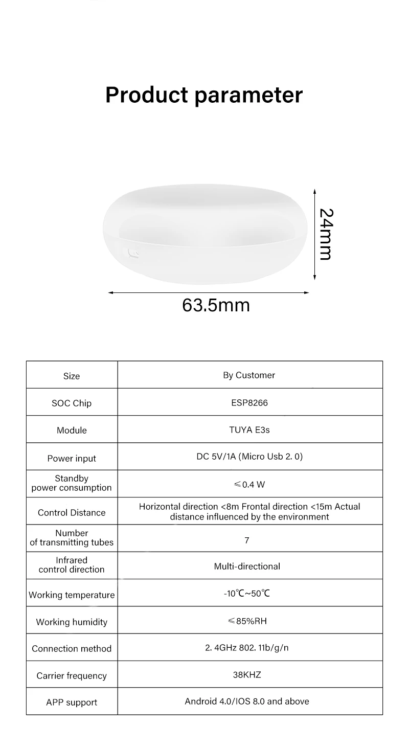 Совместим с Alexa/Echo, Google Home для голосового управления вашим телевизором, STB, кондиционером и вентиляторами. Устройство поддерживает только 2,4G WiFi.
