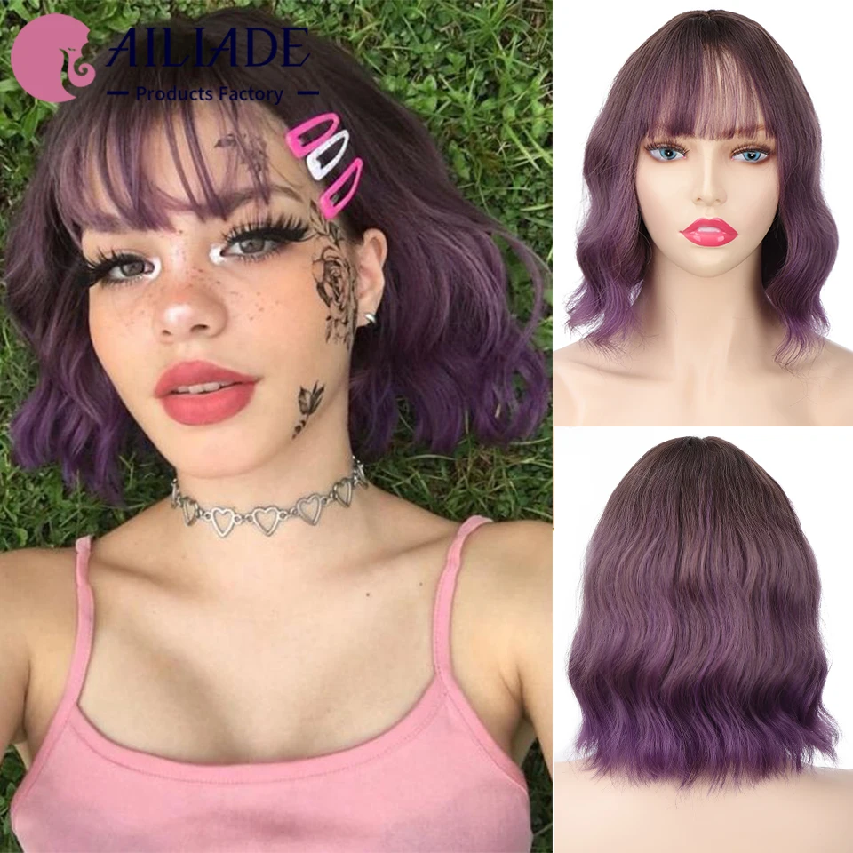 Парик AILIADE с короткими волнистыми волосами Боб и челкой, синтетические волосы для женщин, натуральный парик черного и фиолетового цвета с эффектом омбре для косплевечерние, Лолита