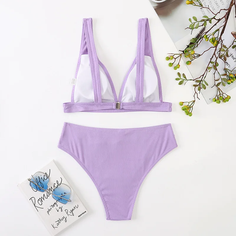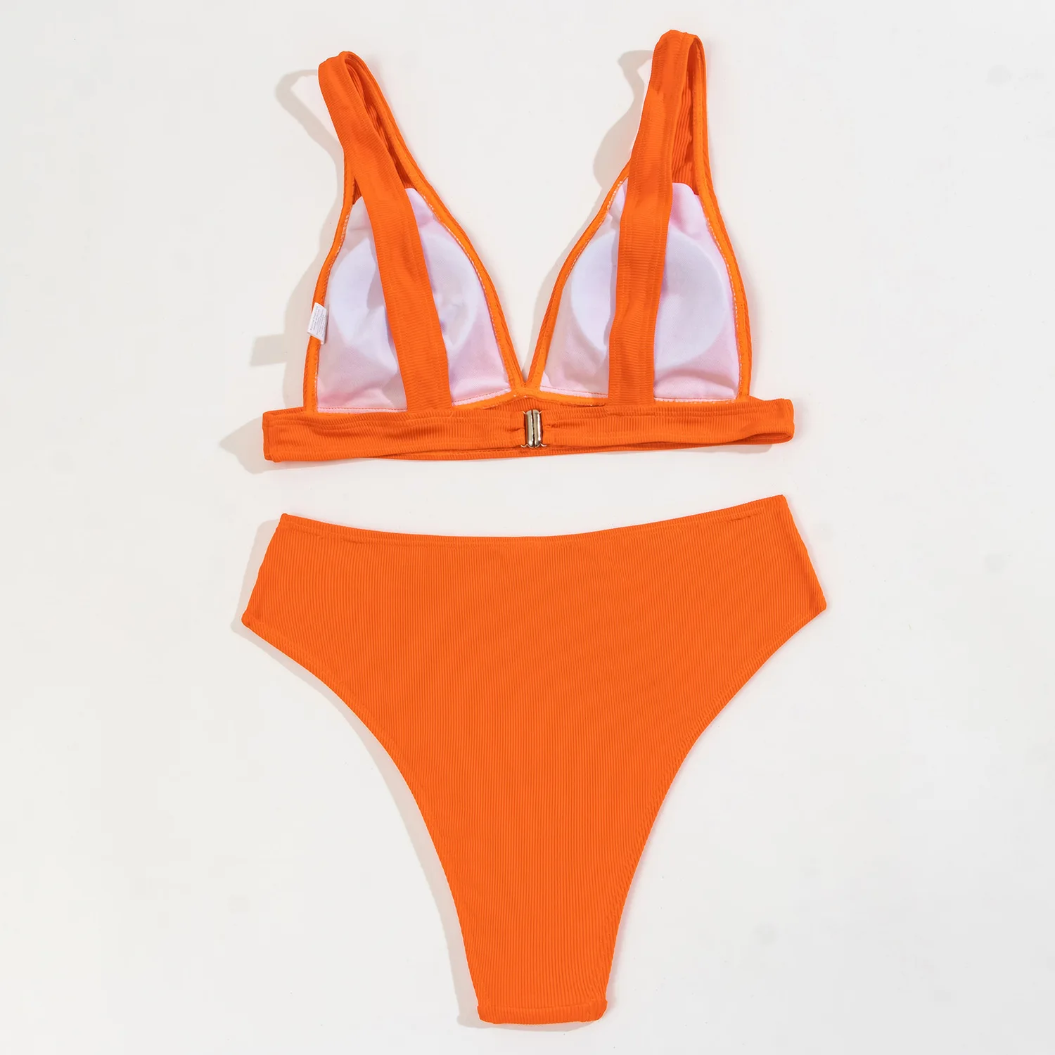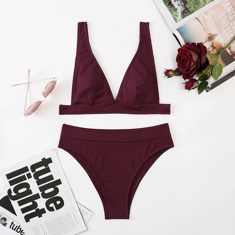 Сексуальный комплект бикини в рубчик, женский купальник пуш-ап с высокой талией, летняя пляжная одежда с V-образным вырезом, однотонный купальный костюм, женский купальник, бикини