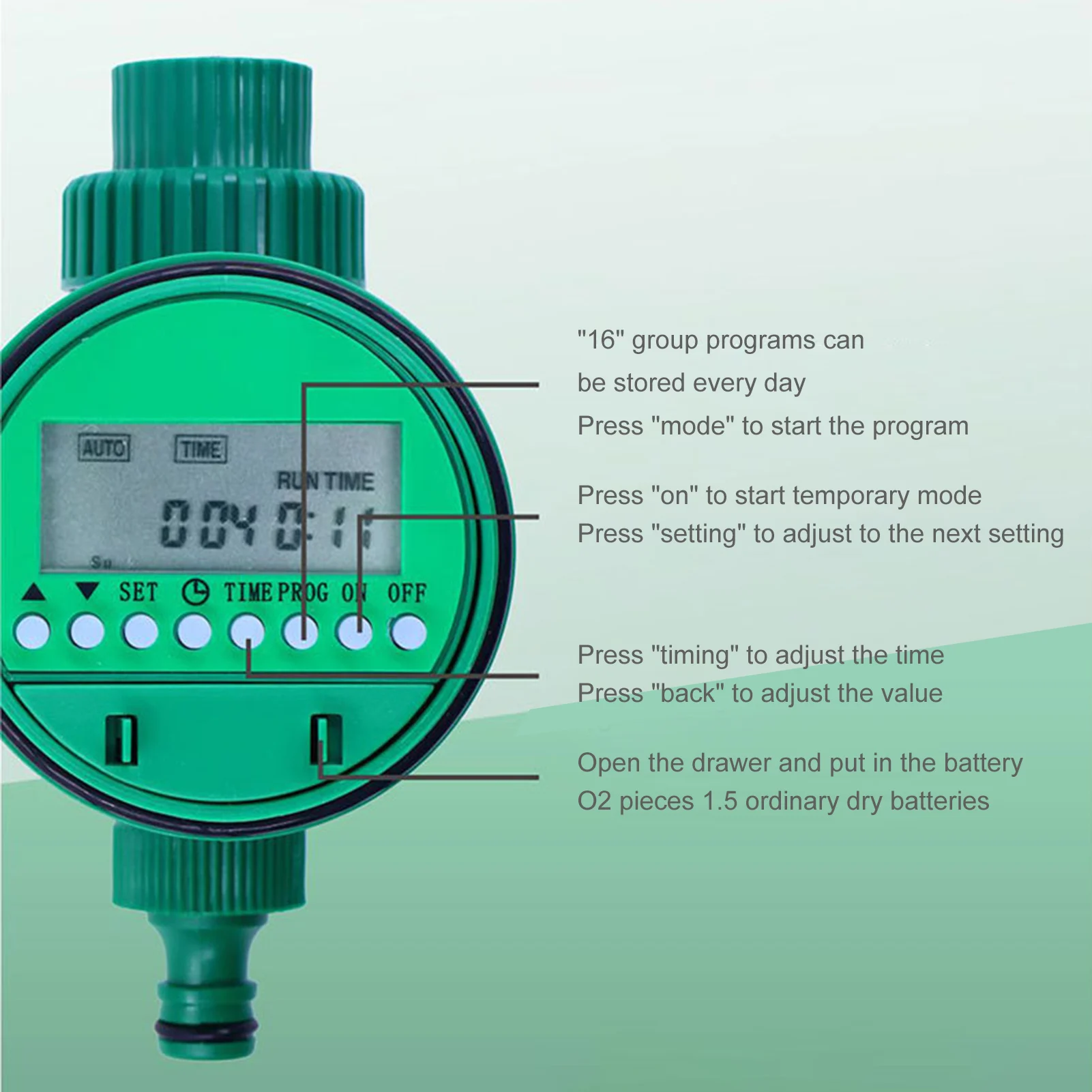 3. Автоматический полив: наш таймер орошения может установить время, поливать регулярно и автоматически поливать цветы. По сравнению с традиционным ирригационным оборудованием, наш автоматический Спринклерный таймер может сэкономить воду и снизить затраты на рабочую силу.4. 16 параметров программы: Электрический таймер для орошения может устанавливать различные программы, автоматическая работа в режиме реального времени, можно установить до 16 программ. Отображение самостоятельной работы в режиме реального времени между листьями составляет 9 часов 59 минут, по крайней мере 1 минуту.5. Многофункциональное Применение: Этот Электрический таймер для орошения может использоваться в различных сценариях. Такие