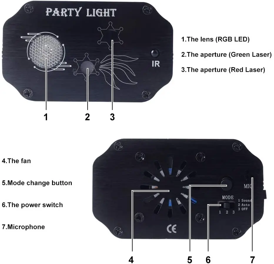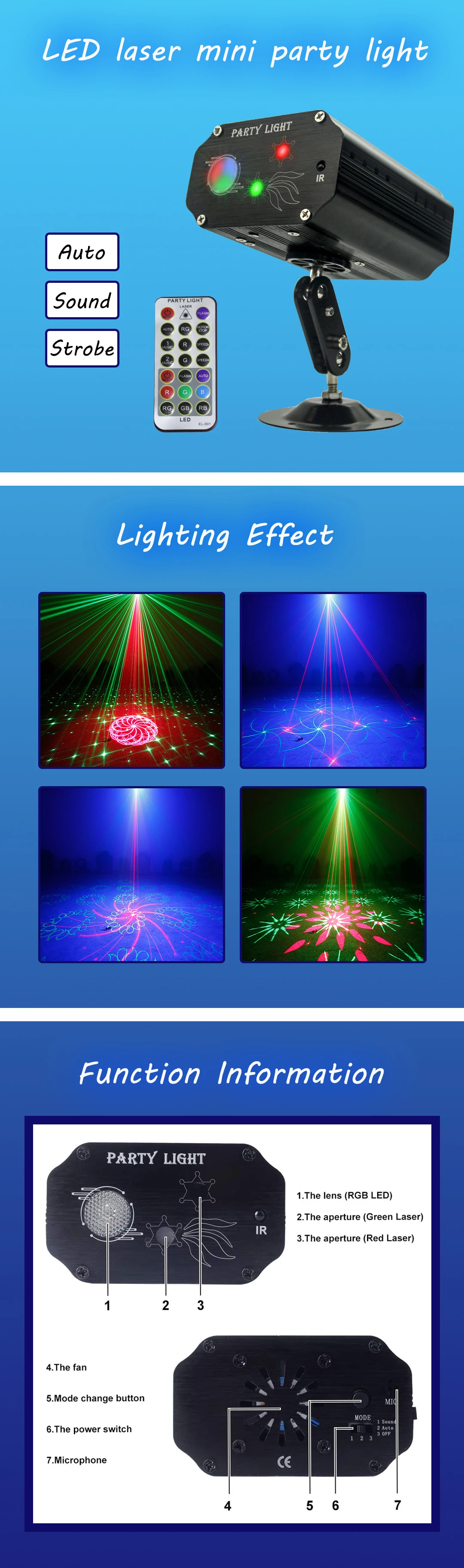 6. Красный и зеленый светильник луч сверкает/двигается/комбайн/появляется/исчезает автоматически или в зависимости от звуковых/музыкальных ритмов, волшебно и красиво.