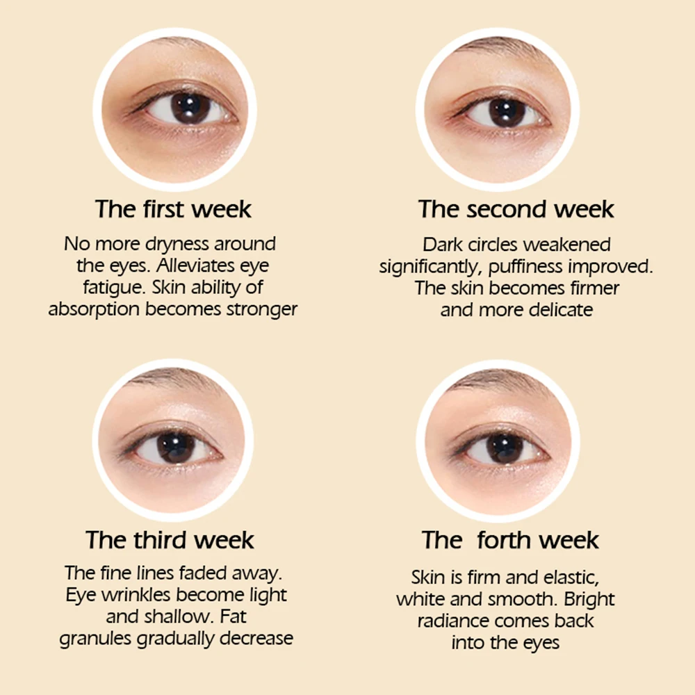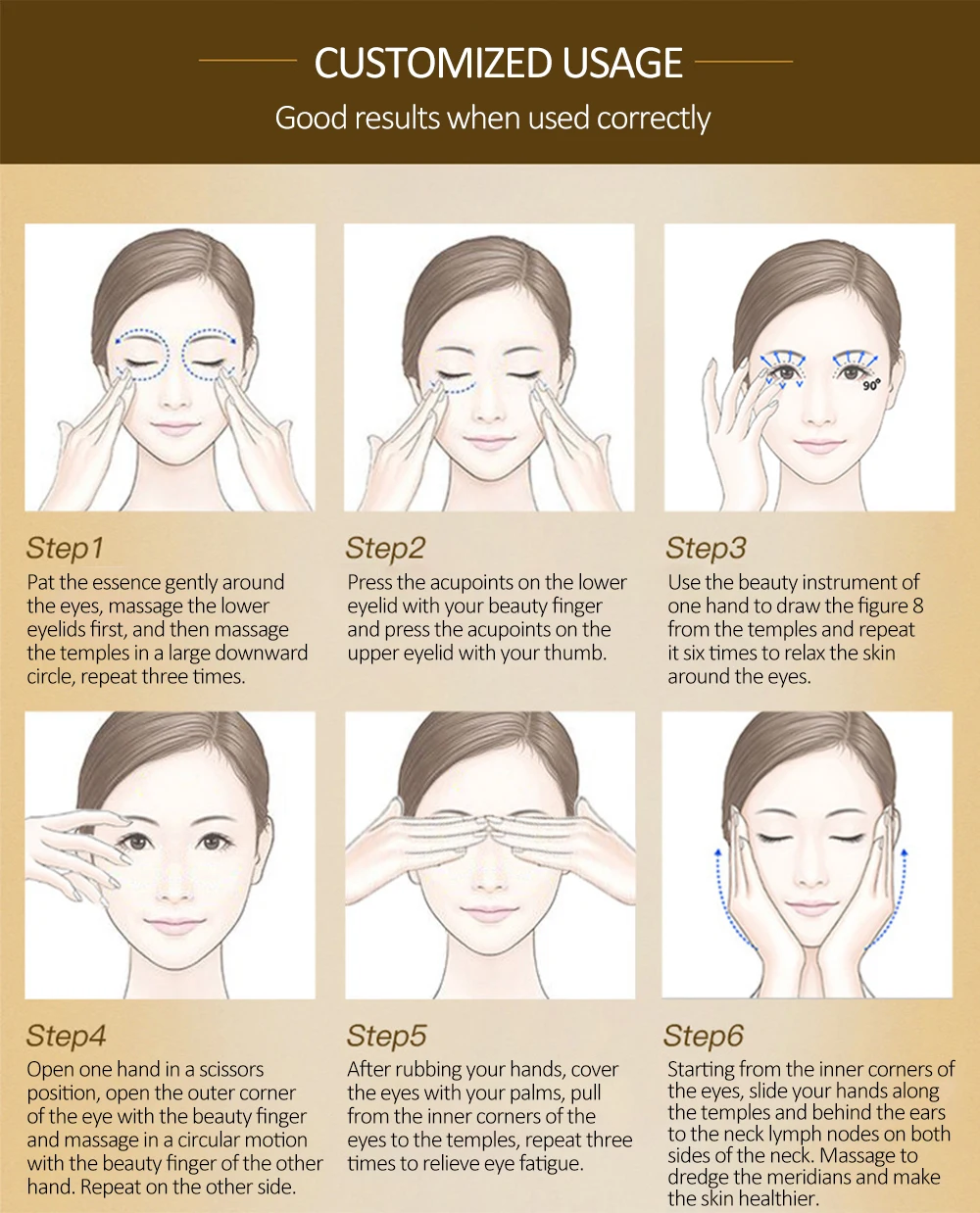 Информация о продукте Название продукта: увлажняющий крем для век Эффективность продукта: улучшает обезвоживание и сухость вокруг глаз, блокирует воду и увлажняет, осветляет и затягивает Характеристики Товара: 30 капсулы (0,25 г) Тип кожи: все типы кожи применимы Срок годности: 3 года Примечание: Этот продукт предназначен только для внешнего использования, пожалуйста, не используйте Использование: Шаг 1 Аккуратно погладьте эссенцию вокруг глаз, сначала массируйте нижние веки, а затем массируйте виски в большом нисходящем круге, повторите три раза. Шаг 2 Нажмите акупунктурные точки на нижнем век с помощью красивого пальца и нажмите акупунктурные точки на верхнем век с большим пальцем. Шаг 3 Используйте косметический инструмент одной руки, чтобы вытянуть фигуру 8 из висков и повторить ее шесть раз, чтобы расслабить кожу вокруг глаз. Шаг 4 Откройте одну руку в положении ножниц, откройте внешний угол глаза красивым пальцем и массируйте круговым движением красивым пальцем другой руки. Повторите с другой стороны. Шаг 5 Потирая руки, закройте глаза ладонями, вытяните из внутренних углов глаз до висков, повторите три раза, чтобы снять усталость глаз. Шаг 6 Начиная с внутренних углов глаз, проведите руки по вискам и за ушами до лимфатических узлов шеи с обеих сторон шеи. Массаж, чтобы сбросить меридианы и сделать кожу более здоровой.