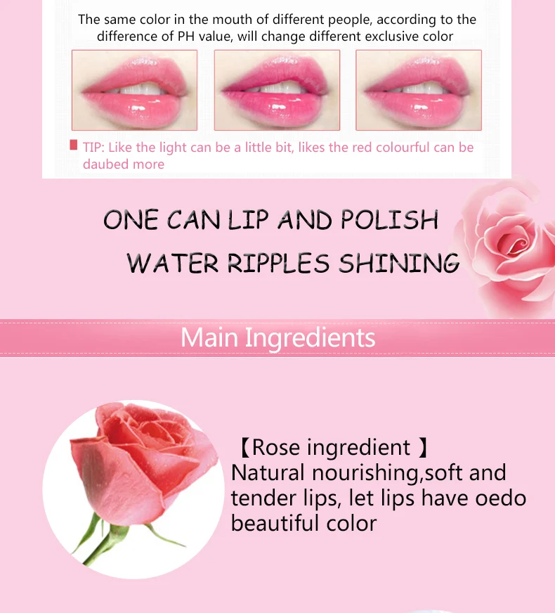 Содержит розовую эссенцию и увлажняющие ингредиенты, питает полипептид, разбавляет губы, мышцы губ, образует питательную пленку, успокаивает, увлажняет губы, осветляет аромат пасты Qingyang, оттеняет цвет губ, гладкая и нежная кожа вокруг губ, очаровательные губы.