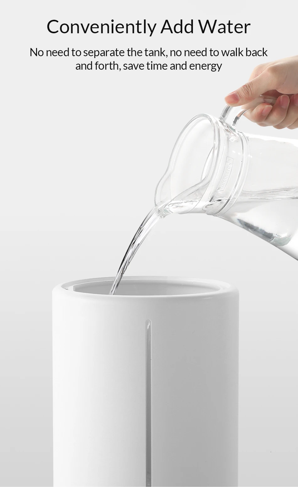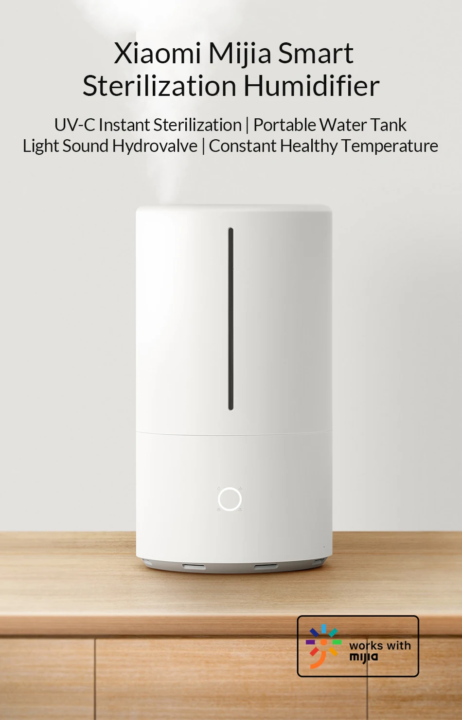 Основная особенность:UV-C мгновенной стерилизацииПортативный дизайн воды, удобно добавлять воду без разделения резервуара для водыПрозрачная Сегментированная петля состояния, прозрачный резервуар для визуализацииКерамический сердечник высокочастотная система распыления, мягкий окружающий светильник, Круглый вход в нижней части, спреиРежим постоянной влажности может автоматически регулировать количество туманаУправление приложением MiHome, дистанционное управление увлажнением