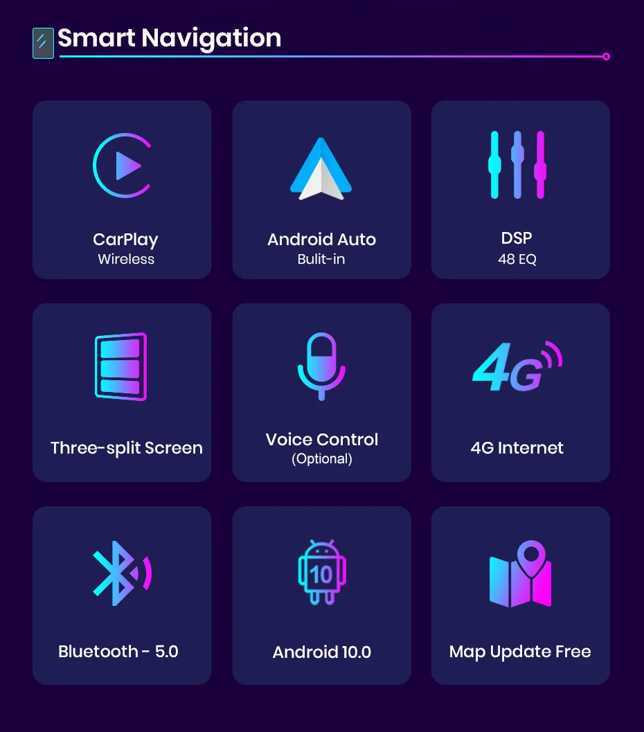 > Основные функции: Android 10,0 + 9,7 дюймов IPS Экран + 8 ядро 1,8 ГГц + DDR3 2 ГБ флэш-памяти (2 ГБ/4 Гб опционально) + память 32 ГБ + WIFI и сеть 4G + зеркальная связь + управление рулем + RDS> Специальные функции:1. Штифт-штифт: Кабель питания Junsun radio' является штифтом для штифта, прост в установке;2. Встроенный Carplay/ Android авто: Поддержка беспроводной carplay; Просто используйте телефонный кабель для подключения Android Auto, стабильный и простой в использовании;3. Цифровой звуковой процессор DSP с (16*3) регулировкой эквалайзера 48 эквалайзеров для лучшей музыки. Это не только звук, но и высококачественная стереосистема. Улучшите качество звука, улучшите басы и получите высококачественные звуковые эффекты.Дополнительные аксессуары> Голосовое управление AI: только Junsun поддерживает функцию, просто скажите, что командное слово контролирует радио без рук, делает привод более безопасным;> ADAS DVR, контроль давления в шинах, OBD2,