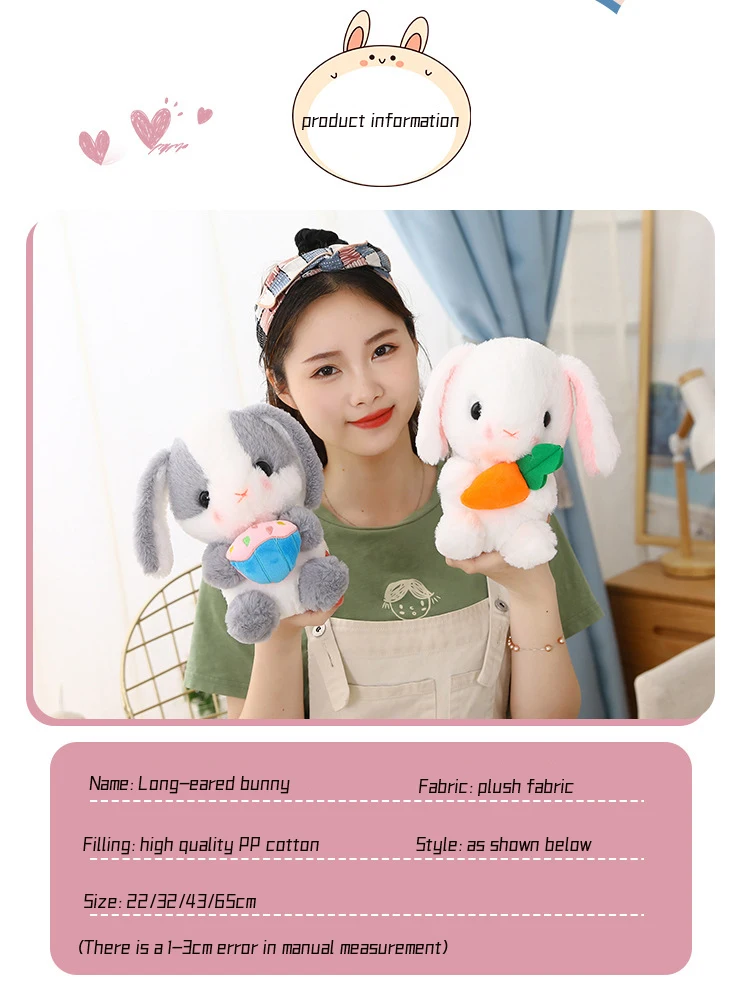 Название: длинный Ушастый кроликТкань: плюшевая тканьНаполнитель: высококачественный полипропиленовый хлопокСтиль: как показано нижеРазмеры: 22/32/43/65 см(При ручном измерении возможна погрешность в 1-3 см)