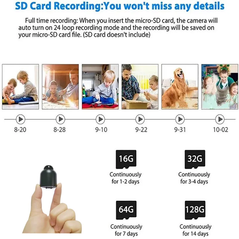 Запись в течение всего времени: когда вы вставляете карту micro-SD, камера будетАвтоматическое включение 24 режима циклической записи и запись будет сохранена на вашемФайл карты micro-SD. (sd-карта не входит в комплект)