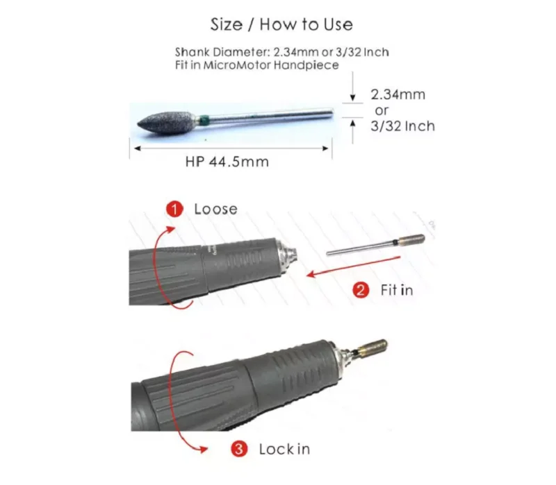 * Спеченные алмазные буры могут быть использованы стоматологическими лабораториями, ювелирными изделиями, лапидарными и драгоценными камнями.* Все боры имеют отметку с цветом для справки о зерне.* Все боры имеют хвостовик HP, 3/32 ", ISO104, диаметр хвостовика 2,35 мм. Подходит для электродвигателя micro.* Как правило, низкая сетка означает грубую зернистость, которая быстро измельчается, но результат будет грубым, а высокая сетка означает мелкую зернистость, медленно измельчается и выйдет из гладкого полировального эффекта.* Мы предлагаем использовать спеченные алмазные боры в соответствии с диапазоном 70 сеток → 100 сеток → 170 сеток → 325 сеток → 600 сеток для достижения хорошего результата. Было бы лучше использовать с нашим обрезным камнем.