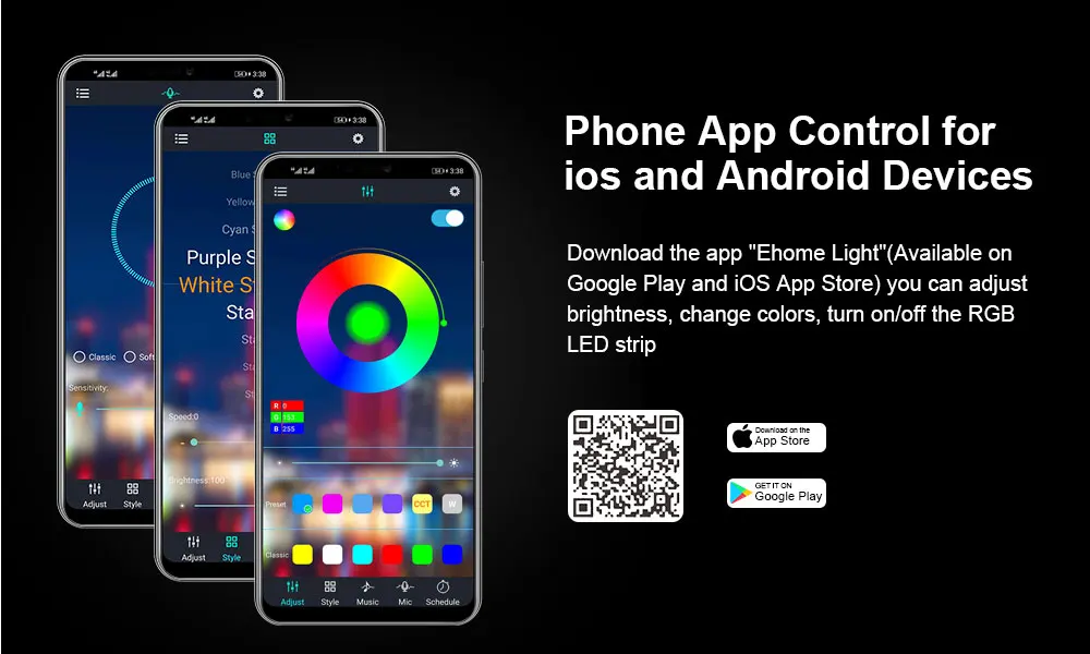 3 кнопочный переключатель, ИК-пульт и приложение для телефона. Для приложения телефона вы можете отсканировать qr-код или найти «светильник Ehome» в APP Store(iOS user) или Google Play (пользователь Android).
