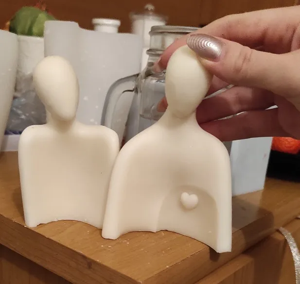 К сожалению, в пару к женской свечи положили мужскую свечу из другого комплекта + с дефектом в районе шеи, он был до заливки. Качество силикона оставляет желать лучшего, вмятины от ногтей остаются моментально... Деньги вернули, и на том спасибо. Использовать свечи в паре не получится(