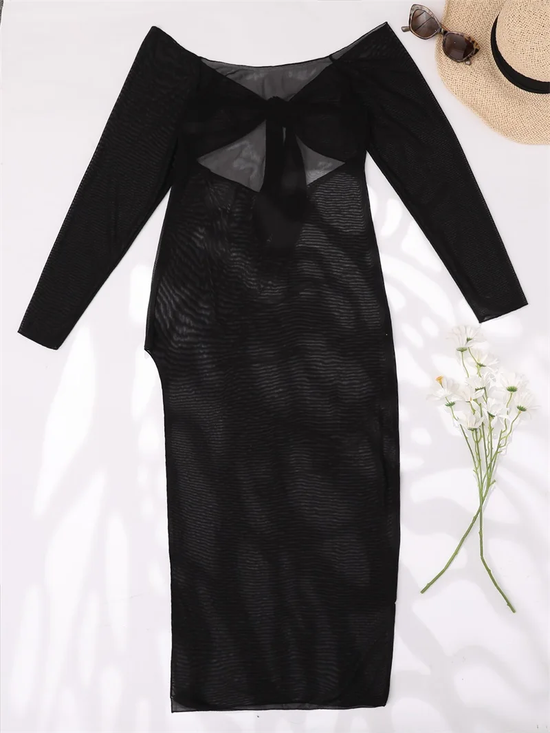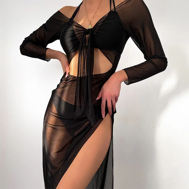 Однотонный кафтан 2022, кардиган с вырезами, модная наружная накидка с длинным рукавом, парео с высоким разрезом, бандажные накидки, пикантное пляжное платье-саронг
