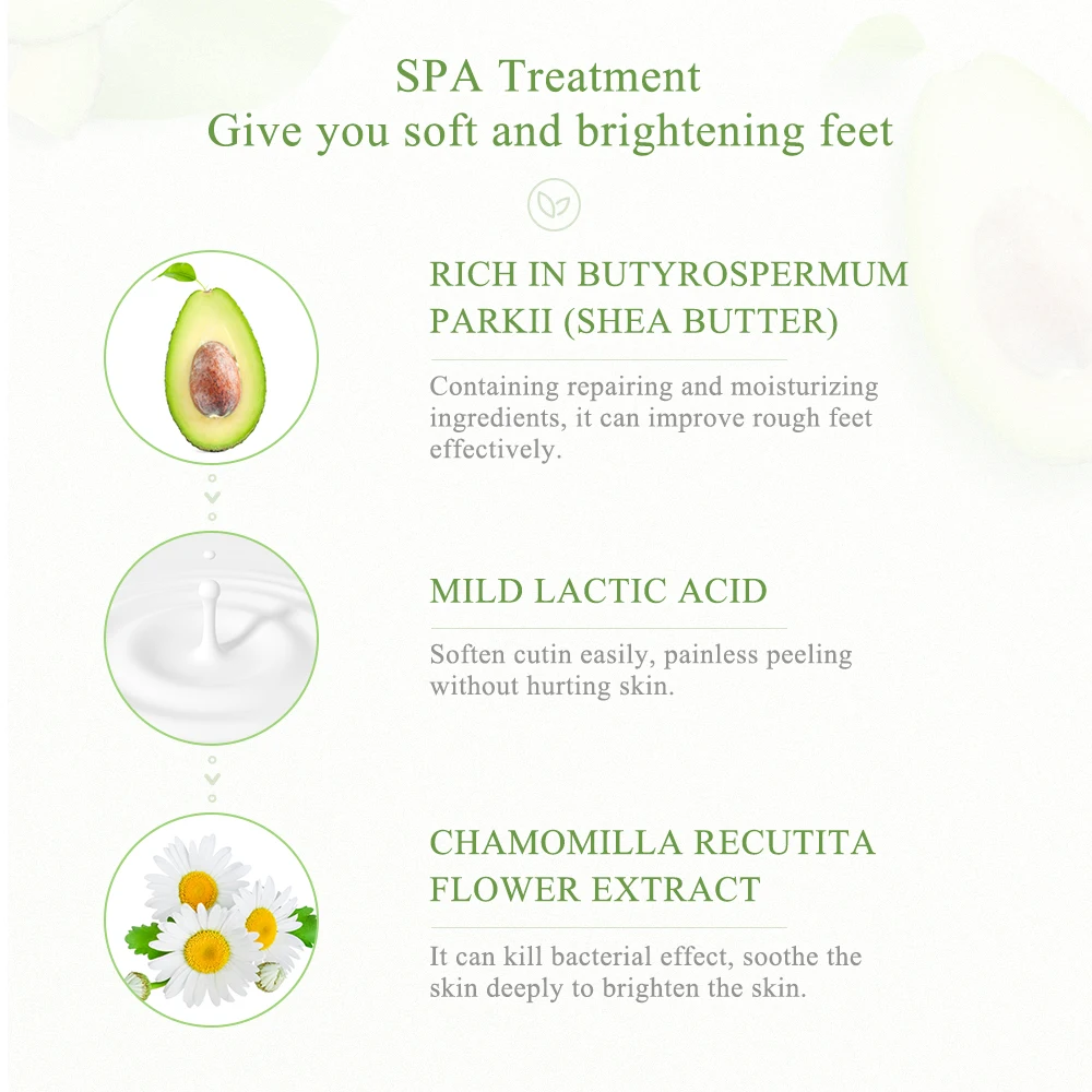 Подарите вам мягкие и осветляющие ноги● Богатый бутиросперматом PARKII (масло ши)Содержит восстанавливающие и увлажняющие ингредиенты, они могут эффективно улучшать грубые ноги.● Мягкая молочная кислотаСмягчить кутин легко, безболезненный пилинг, не повреждая кожу.● Экстракт цветов RECUTITA chamomillaОн может убить бактериальный эффект, глубоко успокоить кожу, чтобы осветить кожу.